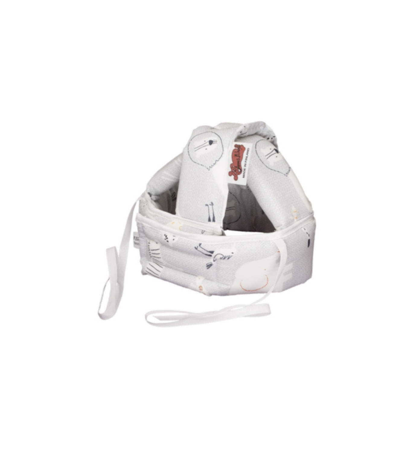 Huolettomiin kävelyharjoituksiin suojaa tuo konttauspäähine, joka suojaa kolhuilta. Päähine on valmistettu puuvillaisesta kankaasta, jonka sisällä on vaahtomuovi. Koko on säädettävissä tarralla ja konttauspäähine kiinnitetään leuan alle nauhakiinnityksellä.