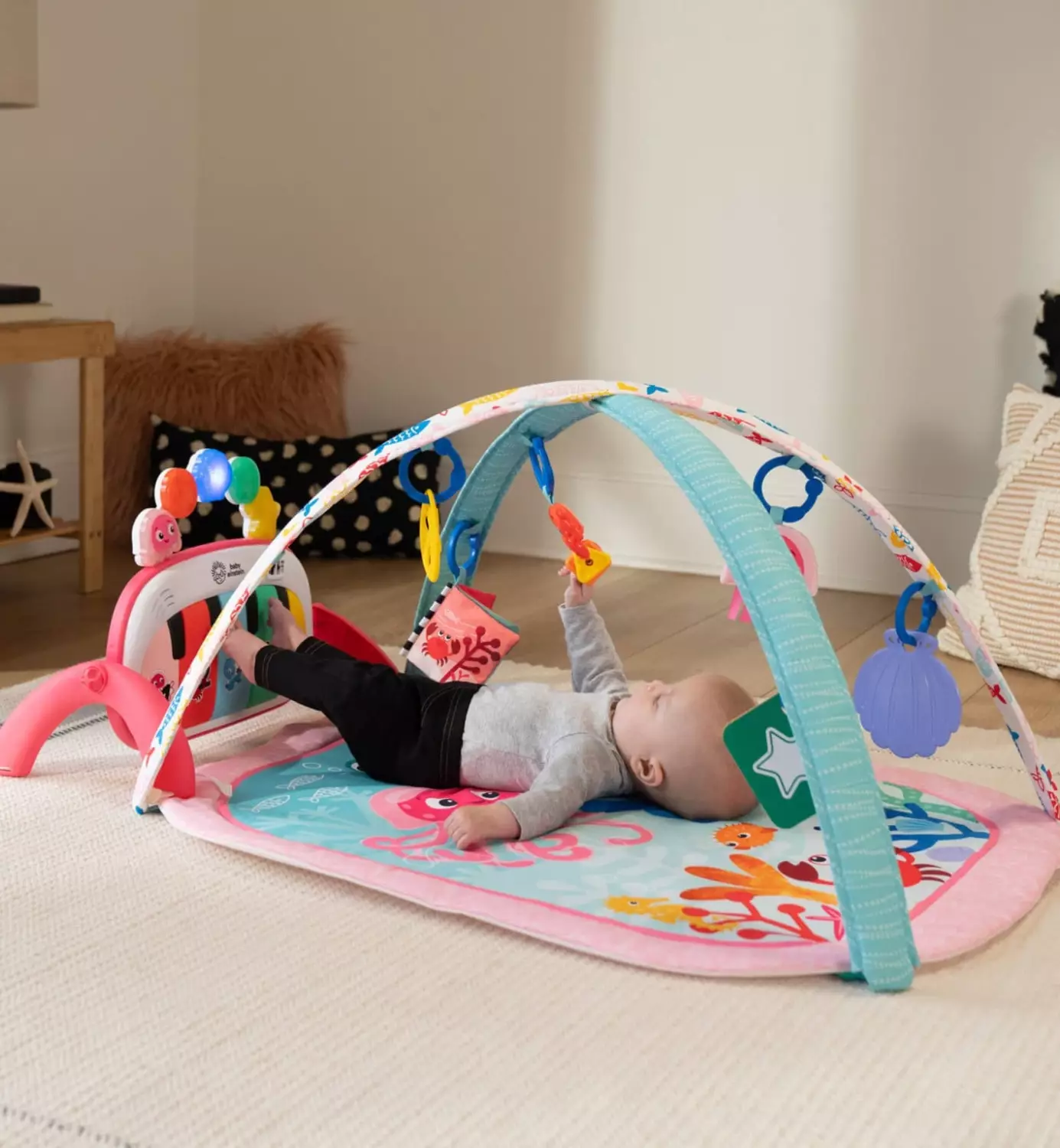 - Sisältää: pehmustettu leikkialusta, lelukaari, musiikkipaneeli, useita irrotettavia leluja