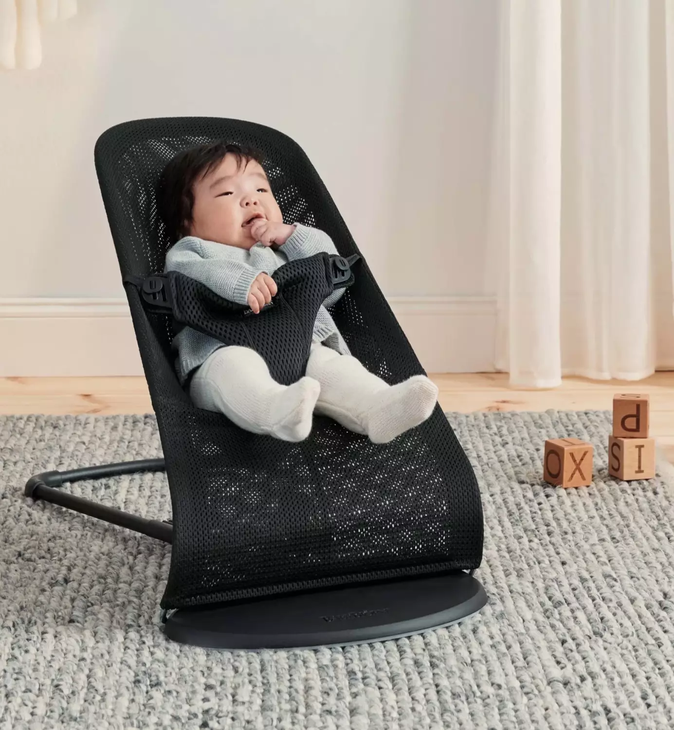 Ergonomic baby bouncer with natural rocking. Bouncer Bliss is a cosy place for your baby to play or rest close by you, while you take a shower or prepare a meal. When your baby kicks their legs or waves their arms, the baby bouncer rocks gently. No batteries needed – the baby bouncer runs on pure fun! Playing in the baby bouncer also helps your baby to develop their motor skills and balance. Bouncer Bliss can be used from newborn and up to the age of 2 years. When your child has learned to sit down without help, you simply turn the fabric seat around and use the bouncer as a comfy children’s chair. The baby bouncer gives good support to your baby’s back, neck and head. The fitted fabric seat distributes your baby’s weight evenly, which is particularly important for newborn babies. The baby bouncer is available in decoratively stitched cotton fabric. It is free from harmful substances and approved according to OEKO-TEX Standard 100, Class 1 for baby products. A grey base and frame give a soft look. The one-colour mesh fabric and decoratively stitched cotton fabric create a luxurious feeling and make an attractive addition to your home. The baby bouncer is easy to fold up and takes up very little space when folded. There are three different positions for play and rest.