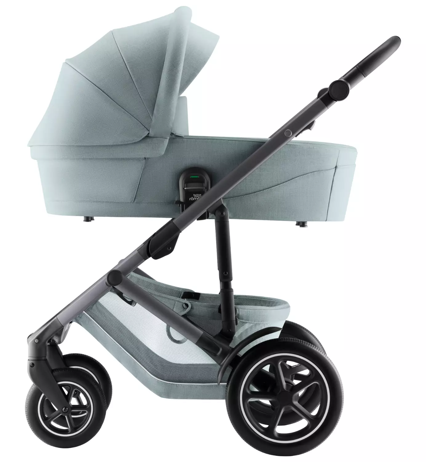 - Vaunukoppa: Tilavassa vaunukopassa ilma kiertää hyvin ja se sopii vastasyntyneille aina noin 6 kuukauden ikään saakka (painoraja 9 kg). Vaunukopassa on UPF 50+ -suojattu kuomu ja panoraamatuuletusikkuna, joka mahdollistaa ilman hyvän kierron kuuminakin päivinä ja näkymiä pienelle matkustajalle lisäten viihtyvyyttä.