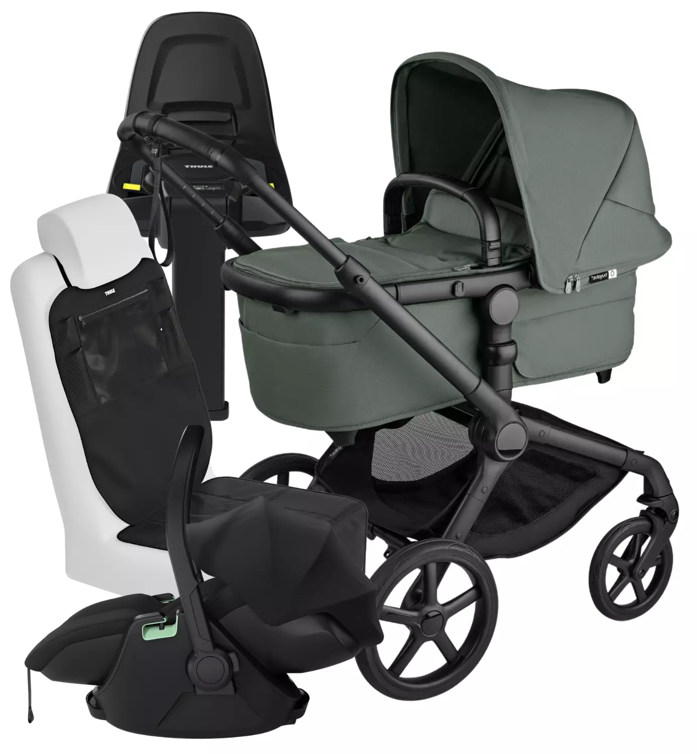 Bugaboo Fox 5 Renew + Thule Maple + Alfi-jalusta = turvallinen, laadukas ja pitkäikäinen kokonaisuus, joka tekee vauva-arjesta huomattavasti sujuvampaa. Mukana myös adapterit kaukalon kiinnittämiseksi rattaan runkoon sekä kätevä penkinsuoja autoon.