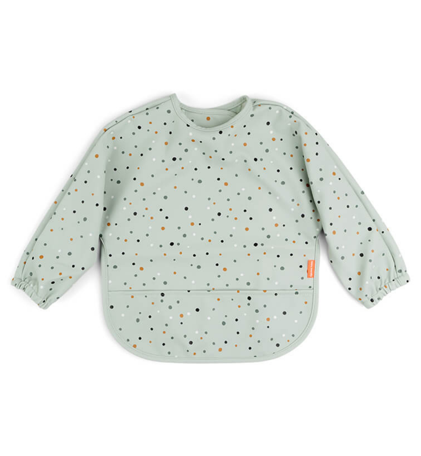 Hihallinen ruokalappu suojaa hyvin niin ruokaillessa kun vaikka askarrellessa. Rokalapussa on tasku, johon ohi menneet ruoat putoavat. Säädettävä tupla kiinnitys takaa hyvän istuvuuden niin vauvalle kun taaperollekin. Ruokalappu on vedenkestävää materiaalia ja hihoissa on kuminauhat. Se on helppo pyyhkäistä puhtaaksi ja kestää myös konepesun.