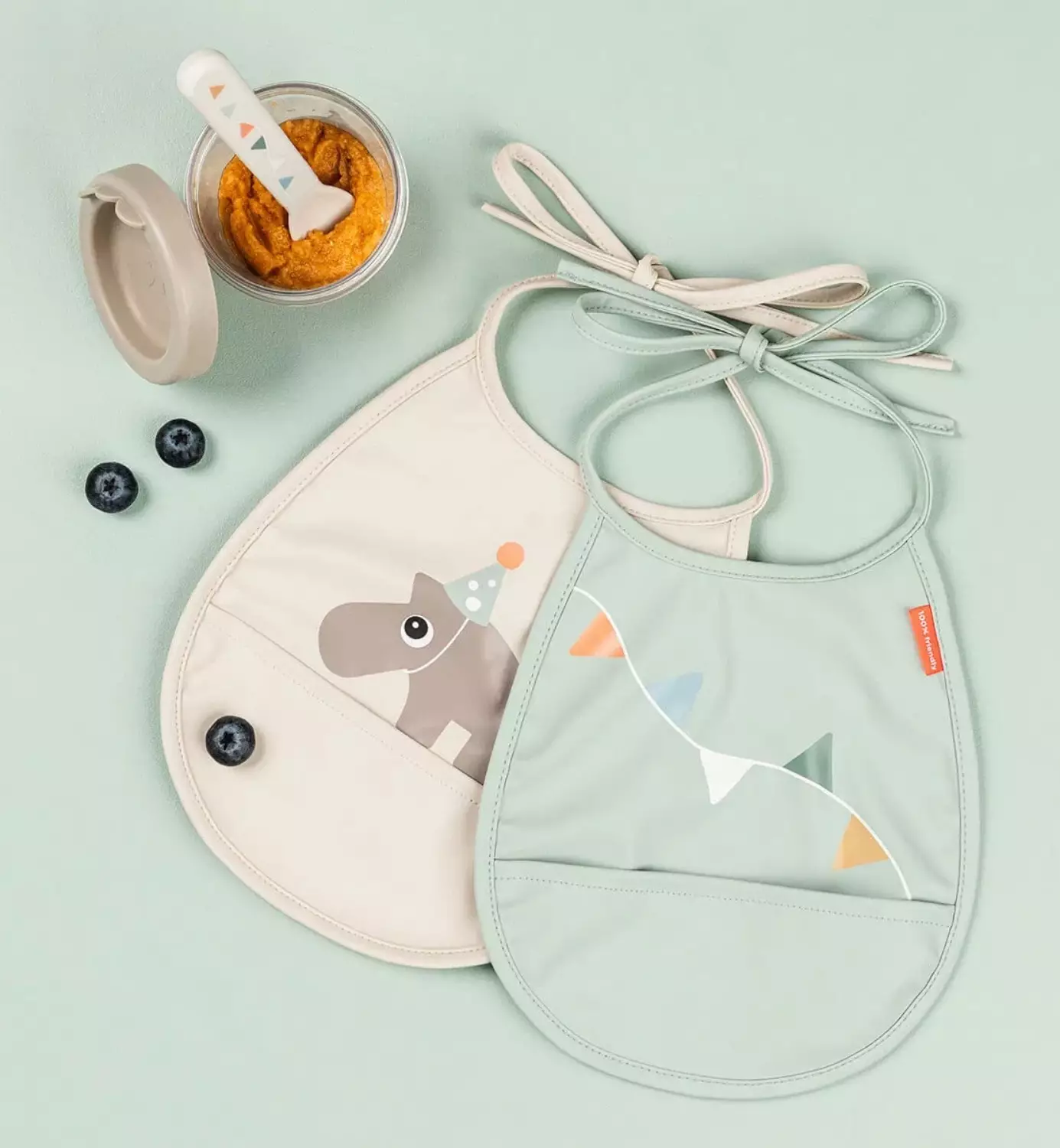 Kätevä esim. hoitolaukussa mukana ja pienimmillä ruokailijoilla. Solmimisnarulla helppo säätää kaula-aukon kokoa.OEKO-TEX® sertifioitu