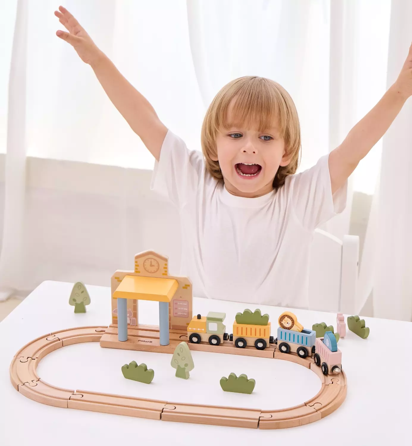 30 osainen PolarB puinen junarata mahdollistaa loputtomasti mielikuvitusleikkejä, joissa junat kiitävät pitkin rataa ja pysähtyvät vilkkaalla asemalla. Mukana tuleva rakennusopas auttaa luomaan junaseikkailulle täydellisen ympäristön ja rata voidaan rakentaa uudelleen joka kerta – vain mielikuvitus on rajana.