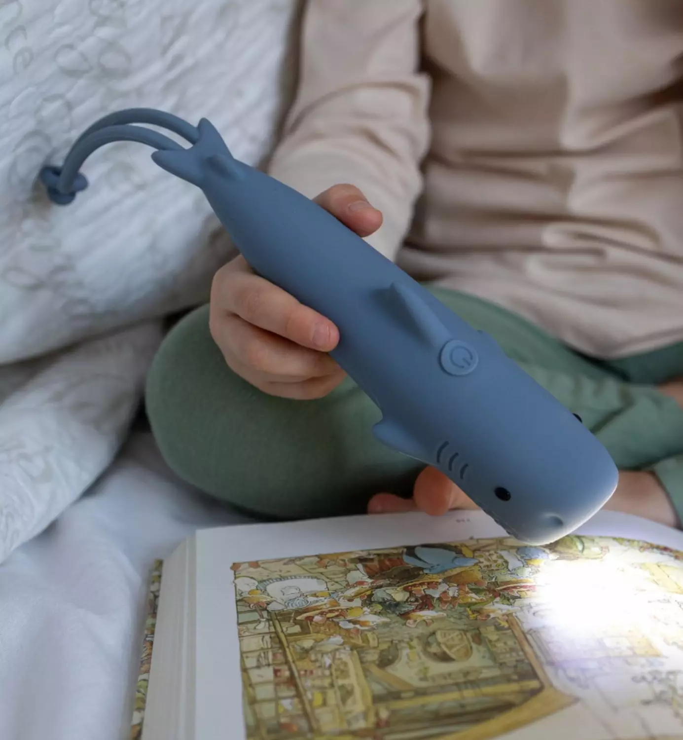 Taskulamppu on pehmeästä silikonista valmistettu hauska ja käytännöllinen valaisin, joka kulkee mukana iltaseikkailuissa, leikeissä ja satutuokioissa. Hain muotoinen taskulamppu syttyy sopivasti pienten käsien kosketuksesta ja sen kirkkauden voi säätää tilanteen mukaan – pehmeä yövalo tai kirkas valo seikkailuun!