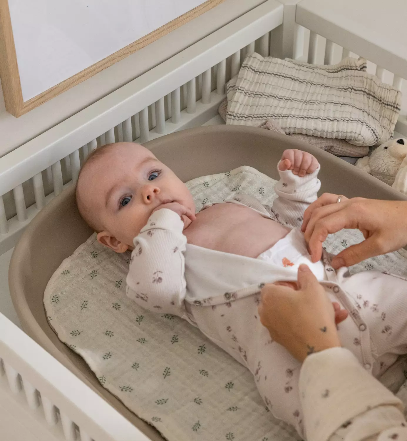 Hoitoalustan päällinen on valmistettu kuudesta kerroksesta musliinia, joka tuntuu erityisen pehmeältä ihoa vasten ja imee hyvin pieniä roiskeita. Kaksipuolinen design tuo arkeen joustavuutta: toisella puolella rauhallinen Seabreeze Beige, toisella kaunis Sophora Leaves -kuosi.
