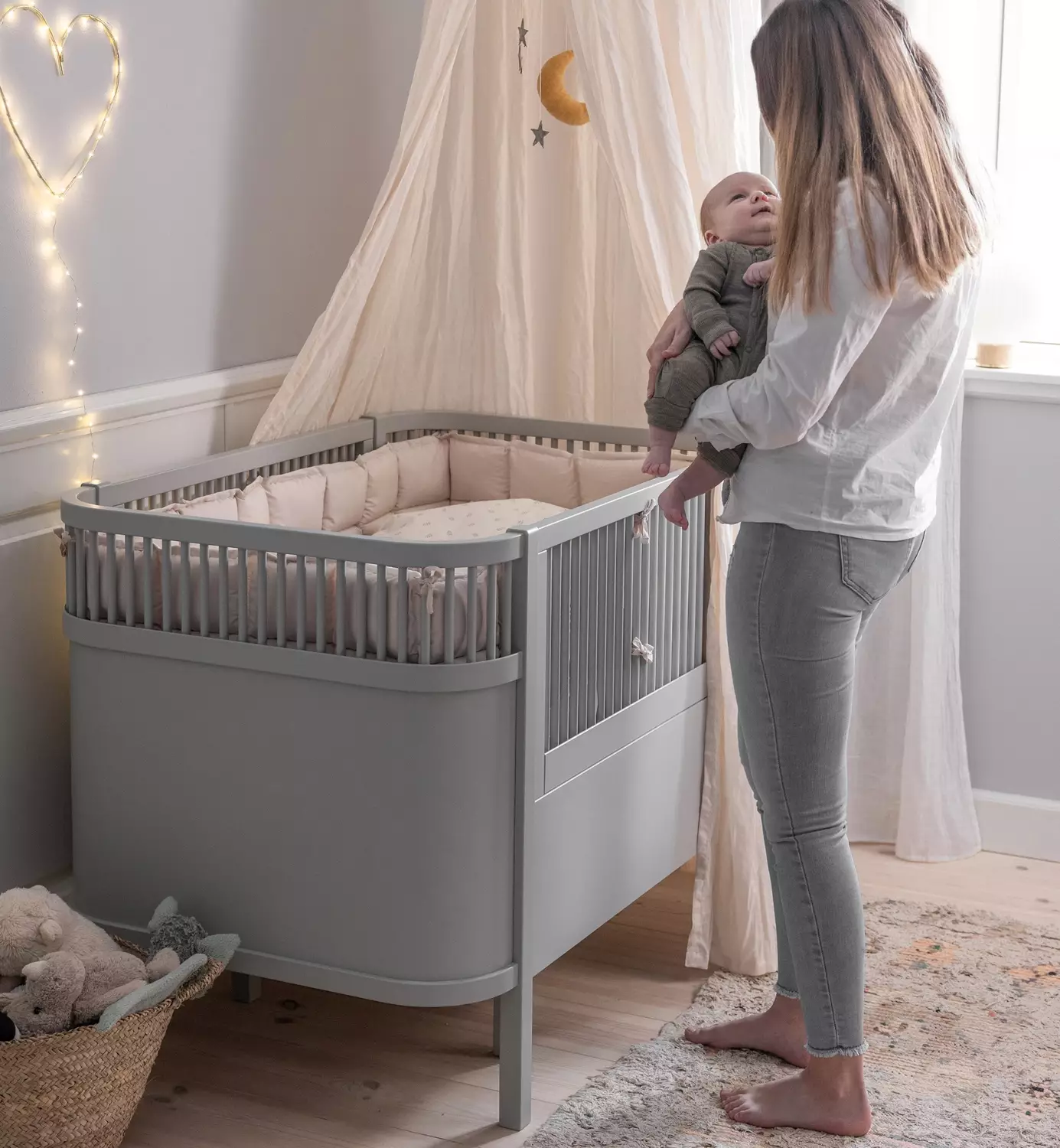Pinnasängyn korotettu pohja helpottaa vauvan sänkyyn laittoa ja sieltä pois nostamista. Ergonomisempi asento vanhemmalle sekä turvallisuutta pienen vauvan käsittelyyn ja niskan tukemiseen.