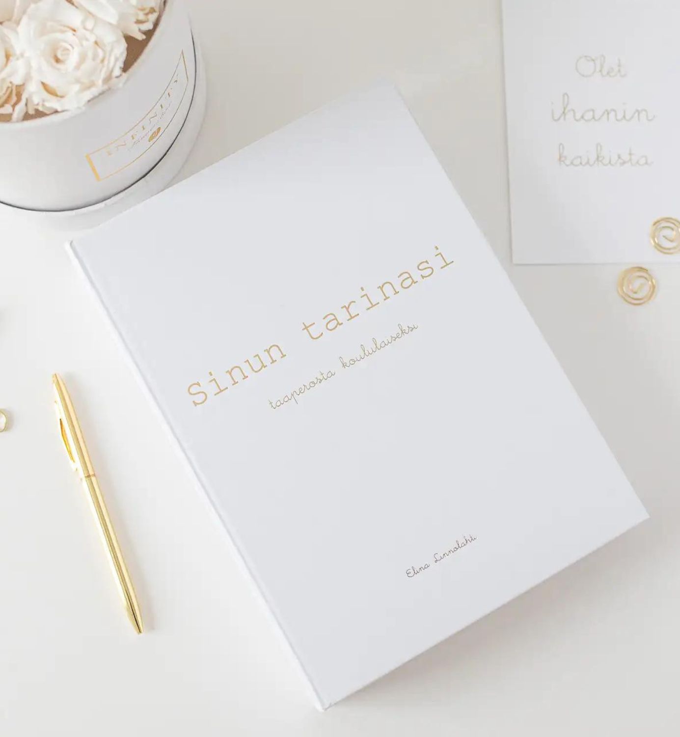 Ulkoasultaan kirja on samanlainen ja yhteensopiva Suloinen Tarina -vauvakirjan kanssa joten ne sopivat hyvin yhteen. Kansi on valkoinen ja kirjan nimi on kultafolioinnilla. Muistokirja on pakattu lahjalaatikkoon, jossa voit myös säilyttää esim. piirustuksia ja muita tärkeitä muistoja!