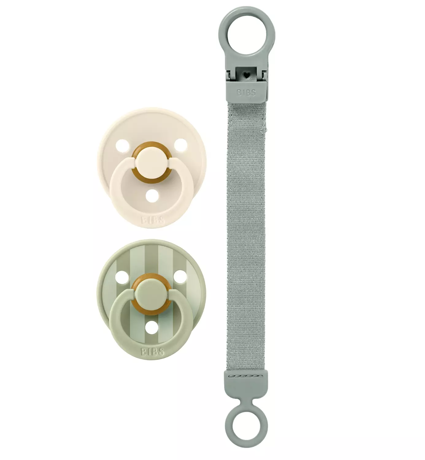 Kaksi luonnonkumista Bibs tuttia sekä kätevä tuttinauha samassa paketissa. Kauniit värit, loistava lahjaidea!