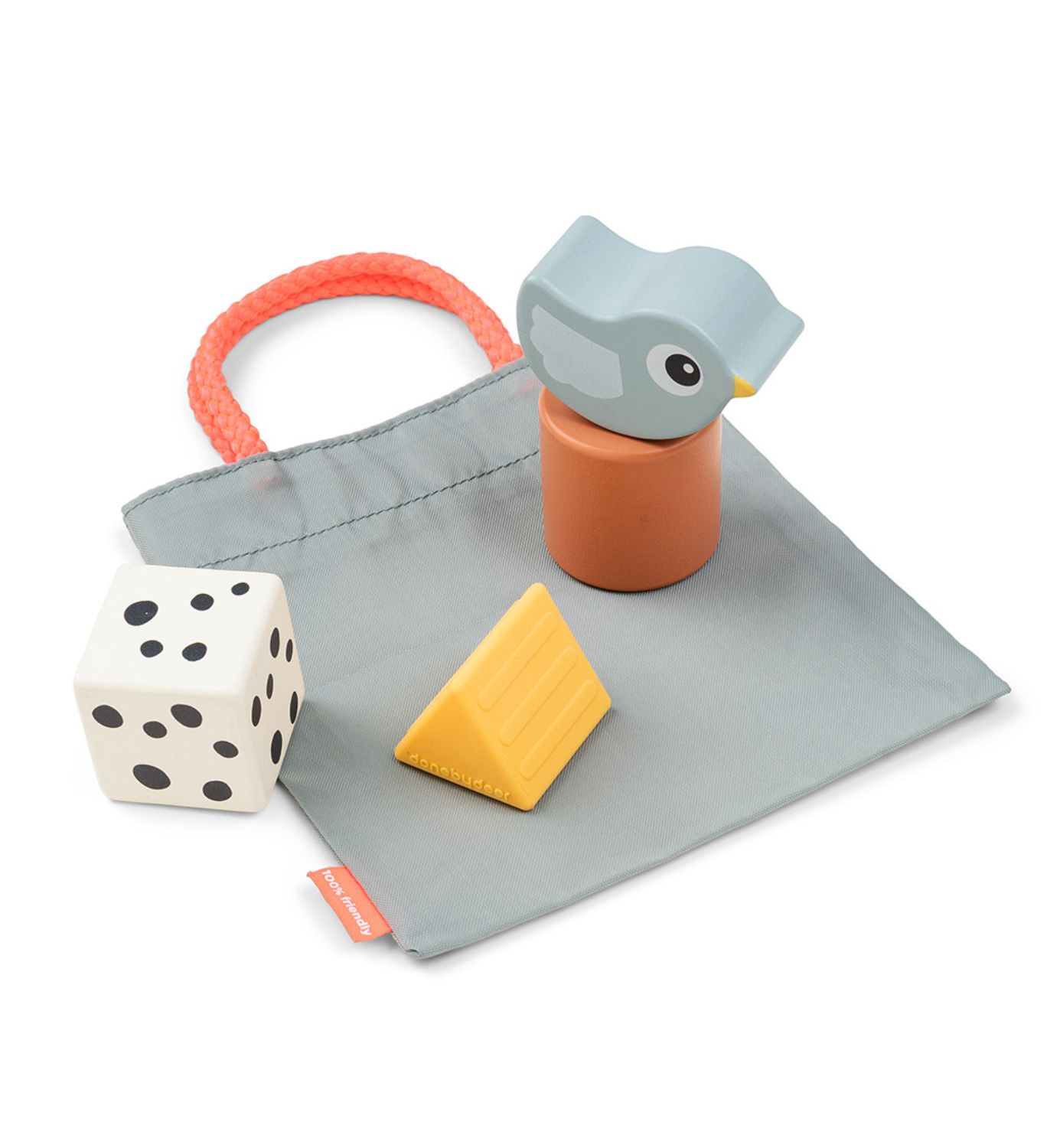 Aistilelusetissä on 4 eri väristä ja muotoista osaa jotka stimuloivat vauvan aisteja. Erilaisissa tekstuureissa ja pinnoissa riittää tutkittavaa. Keltainen osa on pehmeää silikonia, yksi osa on helistin ja kuutiosta löytyy raikkaat kotrastivärit. Palat on muotoiltu siten, että vauvan on helppo tarttua niihin pienillä käsillä. Mukana tulee söpö säilytyspussi