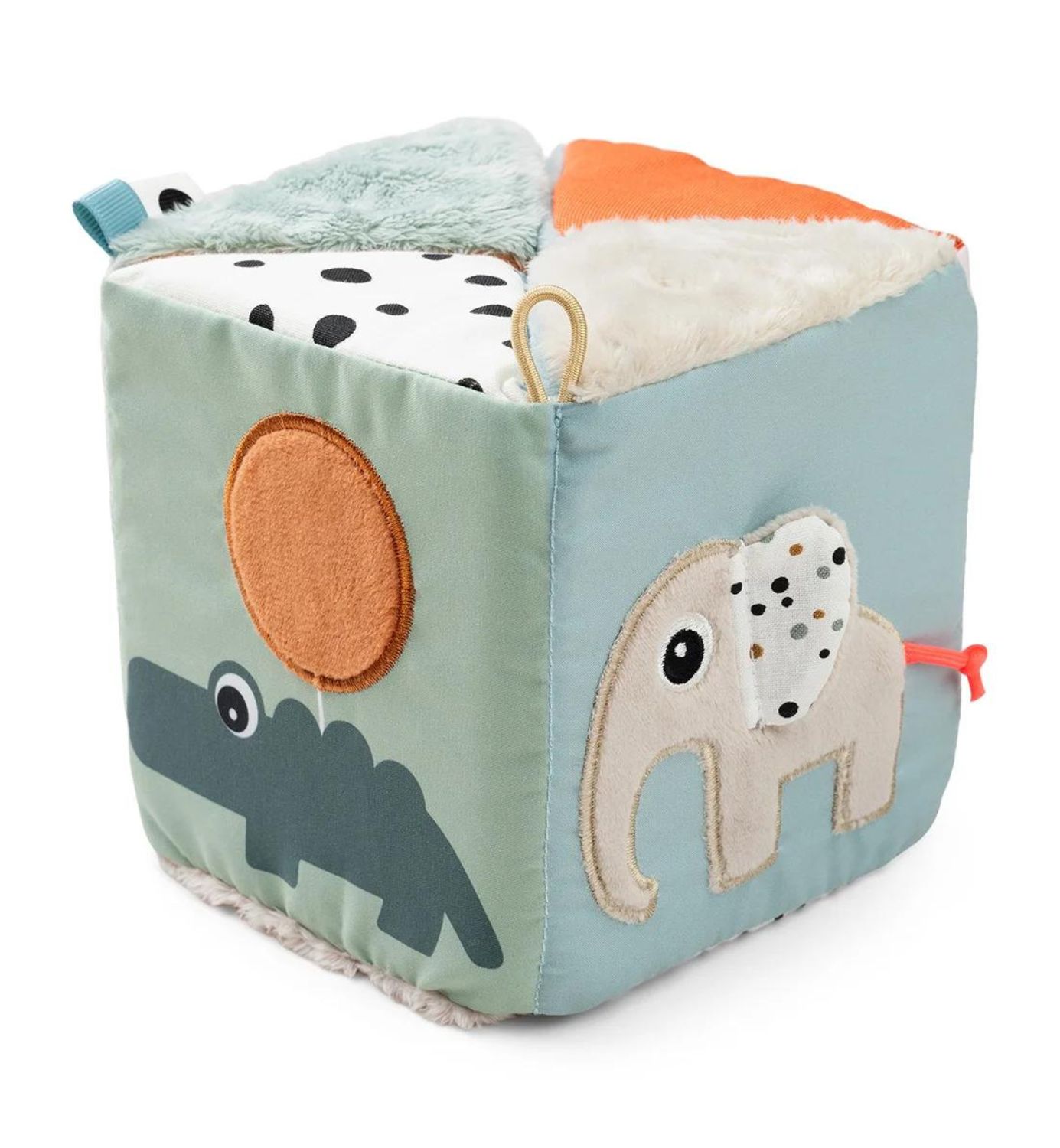 Erilaiset tekstuurit stimuloivat vauvasi kaikkia aisteja ja inspiroivat vauvaasi tutkimaan. Hauskat värit ja kontrastit visuaaliseen stimulaatioon. Rypistävästä paperista kuuluu ääniä niitä kosketettaessa. Kuution saa suljettua tarranauhalla ja sitä voi käyttää noppana motivoimaan ryömimistä. Lelun saa halutessaan kiinni esimerkiksi vaunuihin!