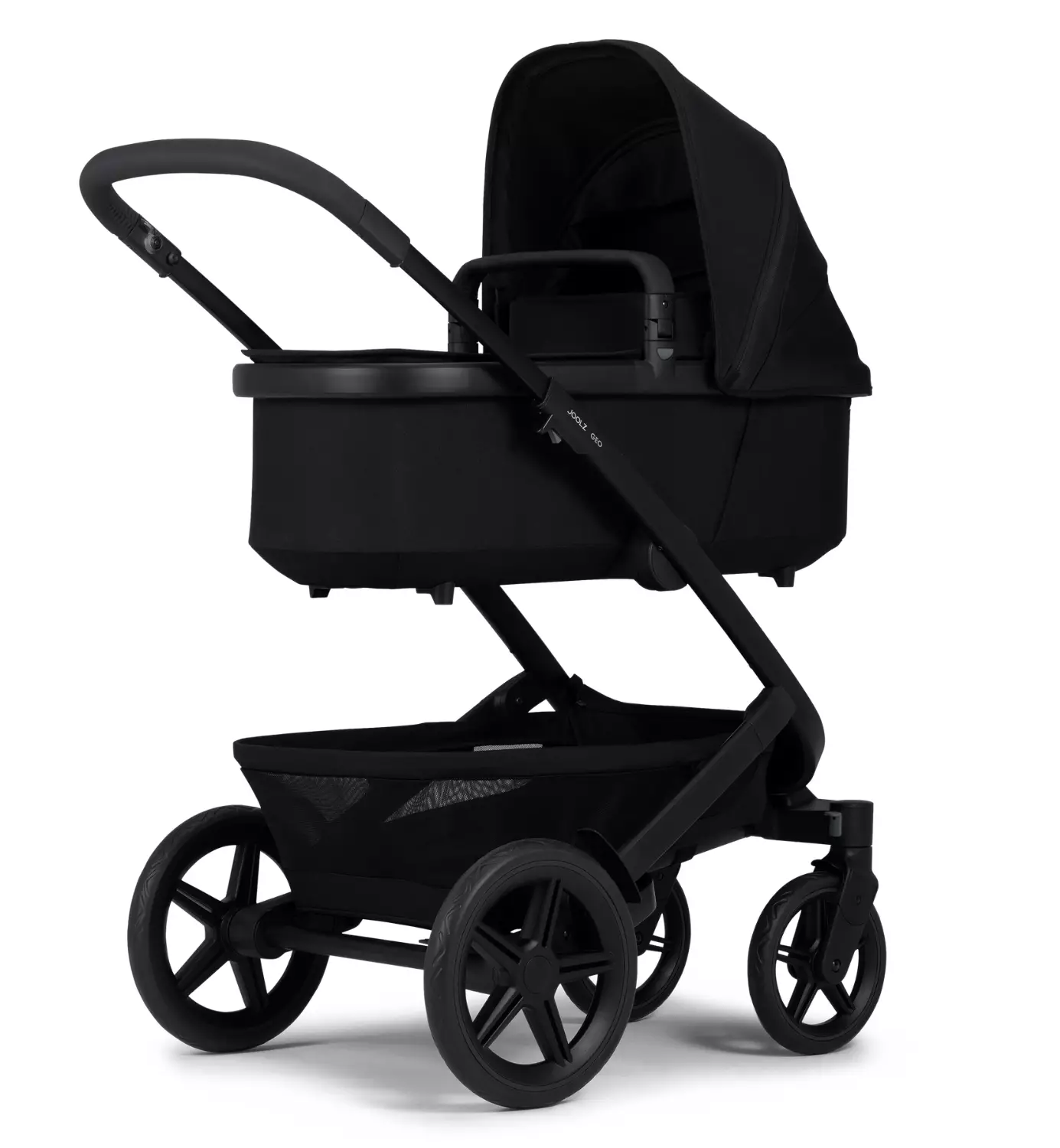 Täydellinen Joolz Geo³setti, joka sisältää rungon, etu- ja takarenkaat, vaunukopan, istuimen, tavarakorin, turvakaaren ja käyttöohjeet.