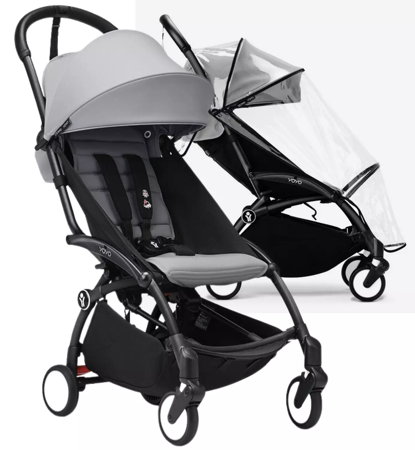 Kevyet ja kompaktit Stokke YOYO³ -matkarattaat starttipaketissa: sisältää rungon, 6+ istuinkankaat ja napakasti istuvan sadesuojan