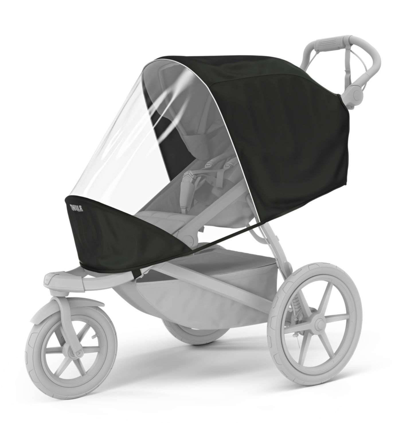Suojaa lapsi ja rattaat sateelta hyvin istuvalla, läpinäkyvällä sadesuojalla. Lapsi näkee hyvin sadesuojan alta ja matka voi jatkua vaikka sade yllättäisi.