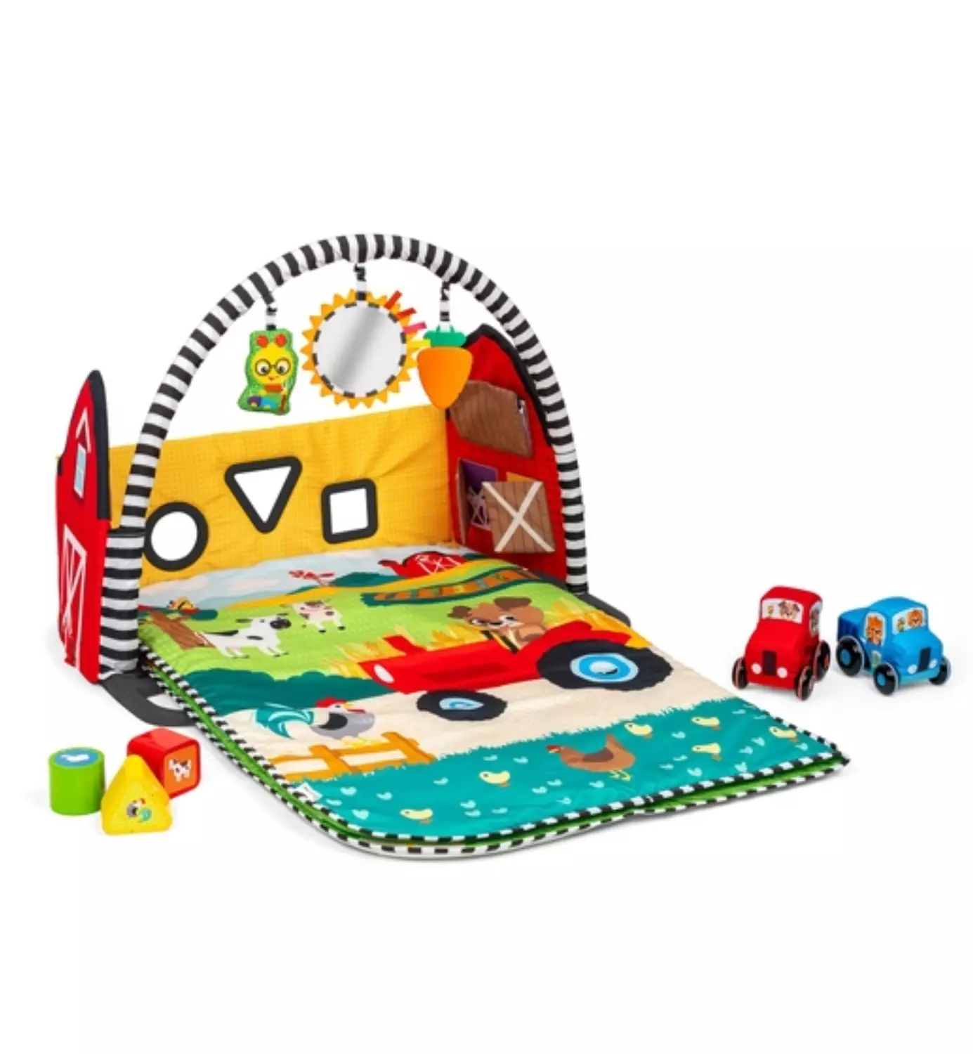 Hauska leikkimatto joka kasvaa vauvan mukana neljällä eri tavalla! Maatila-teemainen leikkimatto tukee vauvan kehitystä syntymästä taaperoikään saakka ja tarjoaa monipuolisia leikki- ja oppimiskokemuksia eri kehitysvaiheissa. Matossa on kolme roikkuvaa lelua, jotka kehittävät vauvan silmä–käsi-koordinaatiota ja houkuttelevat tutkimaan ja tarttumaan. Extraleveä ja pehmustettu leikkimatto on täydellinen vatsallaan leikkimiseen, ja kaksi mukana tulevaa musiikillista ajoneuvolelua aktivoi vauvaa ja kannustaa ryömimään. Kun vauva osaa istua, hän voi tutkia 3D-navettaa, jonka muotopalikkalajittelija ja rapisevat luukut tarjoavat viihdyttävää ja kehittävää istuma-ajan leikkiä. Kun maton aukaisee, paljastuu tieosio, jossa taaperot voivat työntää traktoria ja pickup-autoja.