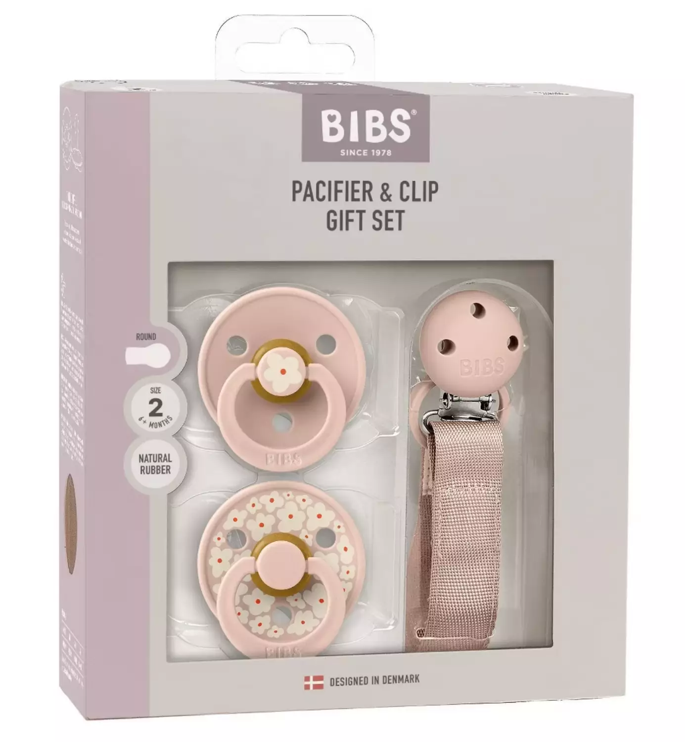 Kaksi luonnonkumista Bibs tuttia sekä kätevä tuttinauha samassa paketissa. Kauniit värit, loistava lahjaidea!