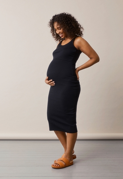 Pohjepituinen äitiysmekko ribbineulosta ohuilla olkaimilla ja kivasti pyöristetyllä kaula-aukolla niin edestä kuin takaa. Valmistettu venyvästä luomupuuvillajerseystä joka mukautuu pehmeästi vartalon muotoon koko raskausajan.