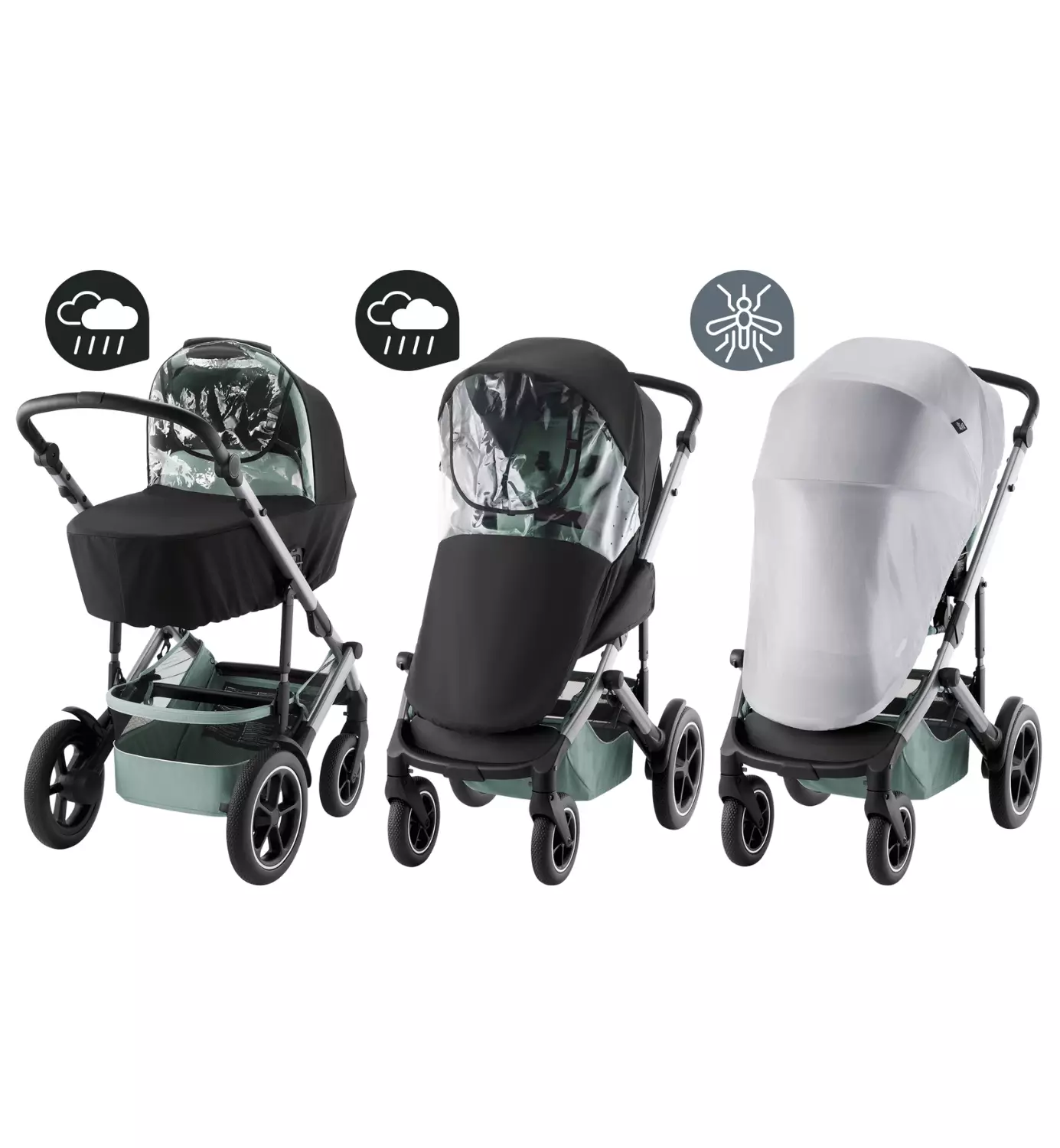 Suojassa sateelta ja itikoilta vaunussa ja rattaassa. Paketissa sadesuojat vaunukoppaan ja rattaaseen sekä hyönteissuoja joka käy molempiin.