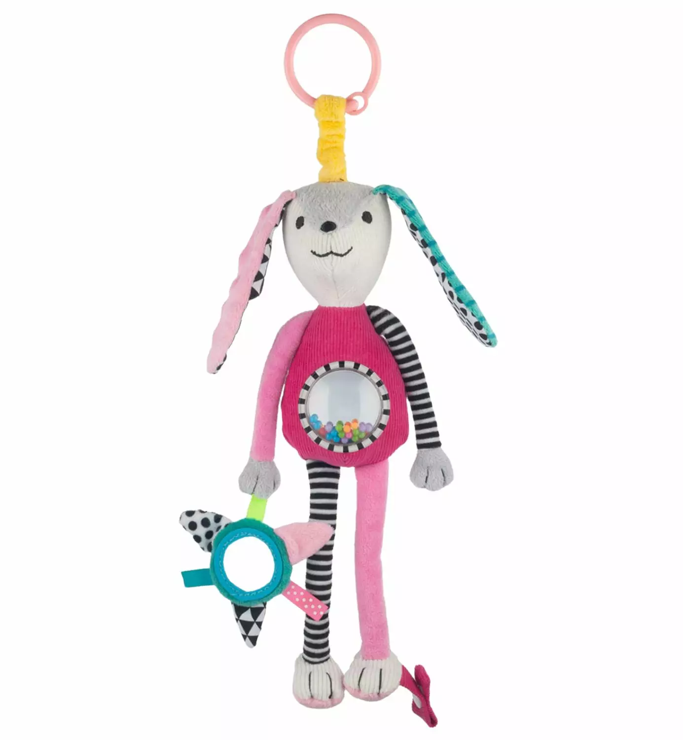 Pehmeä ja miellyttävän tuntuinen aktiviteettilelu tarjoaa vauvalle monipuolista tekemistä jo syntymästä alkaen. Lelussa on kirkkaat ja voimakkaat värit sekä useita vuorovaikutteisia elementtejä, kuten helistin, peili ja rapisevat osat. Erilaiset muodot, materiaalit ja tekstuurit houkuttelevat lasta tutkimaan ja koskettamaan. Monipuolisten toimintojen ansiosta lelu tukee vauvan näön, kuulon ja motoriikan kehitystä sekä käsien ja silmien yhteistyötä. Lelu viihdyttää lasta pitkään ja kannustaa aktiiviseen leikkiin. Kevyen ja universaalin kiinnitysklipsin avulla lelu on helppo kiinnittää vaunuihin, pinnasänkyyn tai turvakaukaloon, joten se kulkee kätevästi mukana arjessa ja matkoilla. Lelu on valmistettu turvallisista materiaaleista ja se on BPA-vapaa.