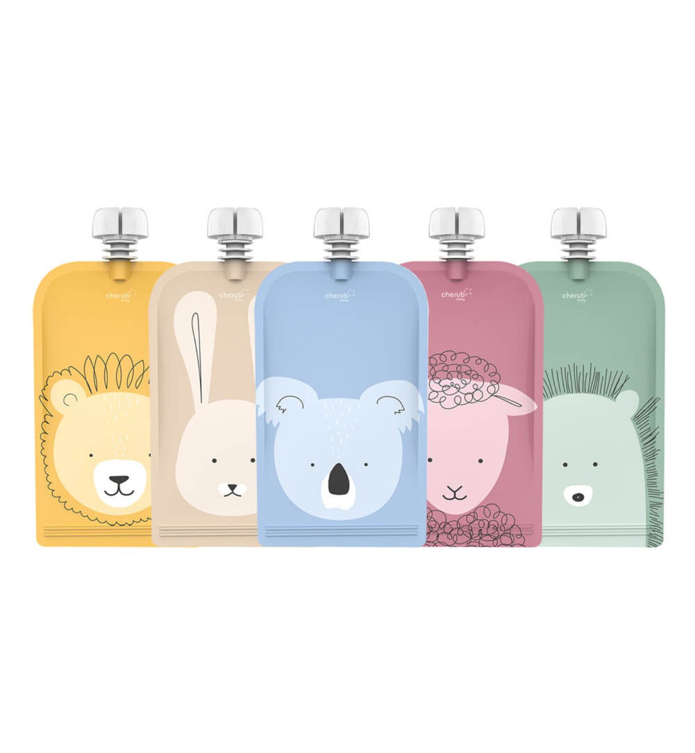 Cherub Baby välipalapussit ovat täydellinen ratkaisu vauvan ja lapsen ruokailuun niin kotona kuin matkoilla. 150 ml:n kokoiset pussit sopivat monipuolisesti esimerkiksi jogurtille, smoothieille, vanukkaalle ja muille välipaloille. Pusseja voi sekä pakastaa että lämmittää ja ne on helppo kuljettaa mukana. Lisävarusteina voit hankkia imukorkin tai ruokapussilusikan, joiden avulla lapsi voi harjoitella ruokailua omatoimisesti.