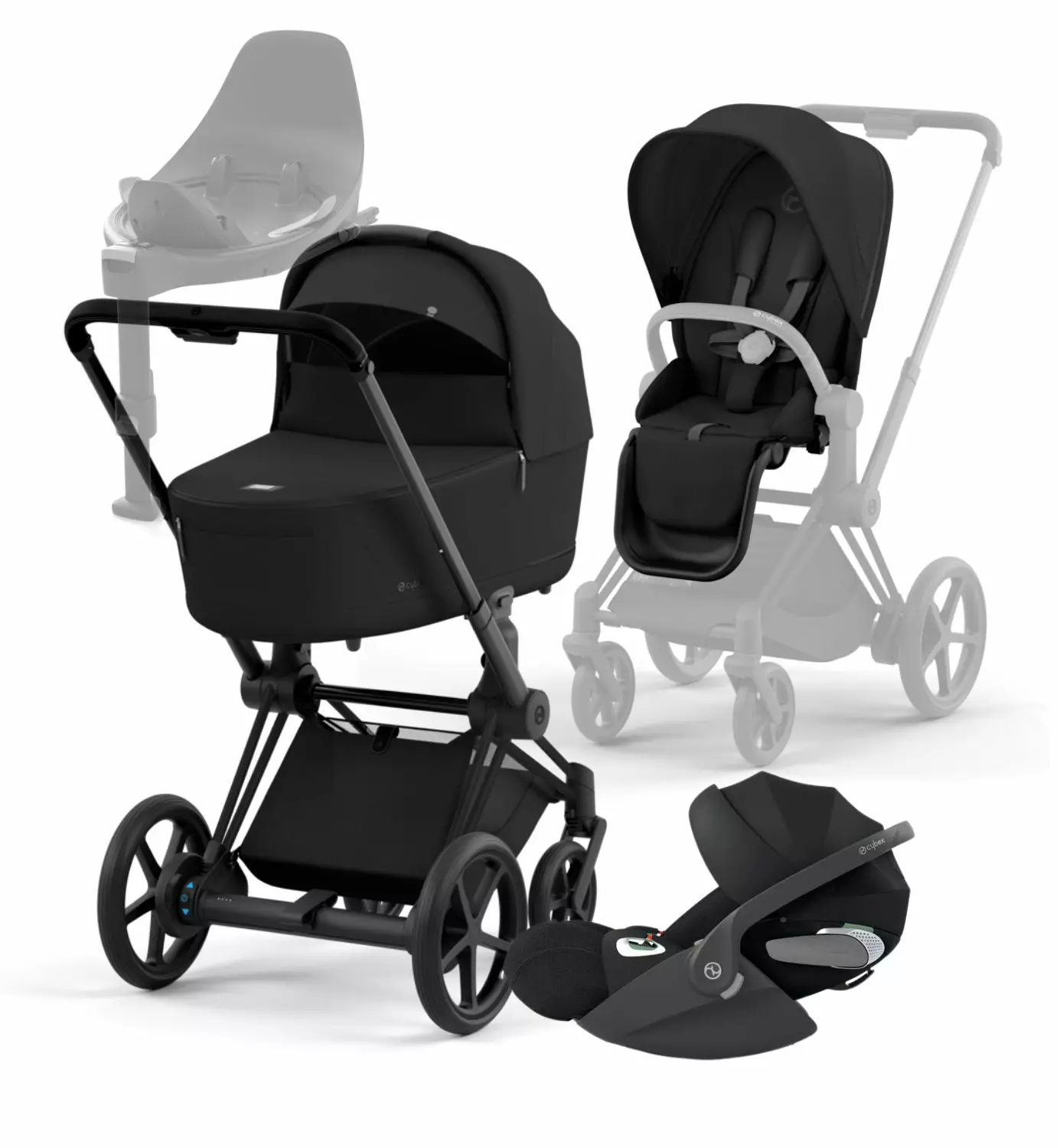 Starttipaketissa Cybex ePriam 4 sähköavusteiset lastenvaunut valitsemallasi runkovärillä sekä Cloud T turvakaukalo Sepia Black sekä Base T isofix-jalusta.