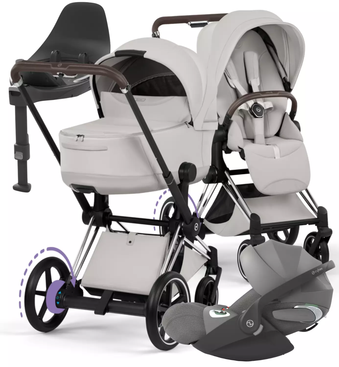 Mukana tulee kaikki mitä tarvitset: vaunut, turvakaukalo, jalusta, adapterit ja sadesuojat. Lopputulos? Arki, joka rullaa kevyemmin, kirjaimellisesti.