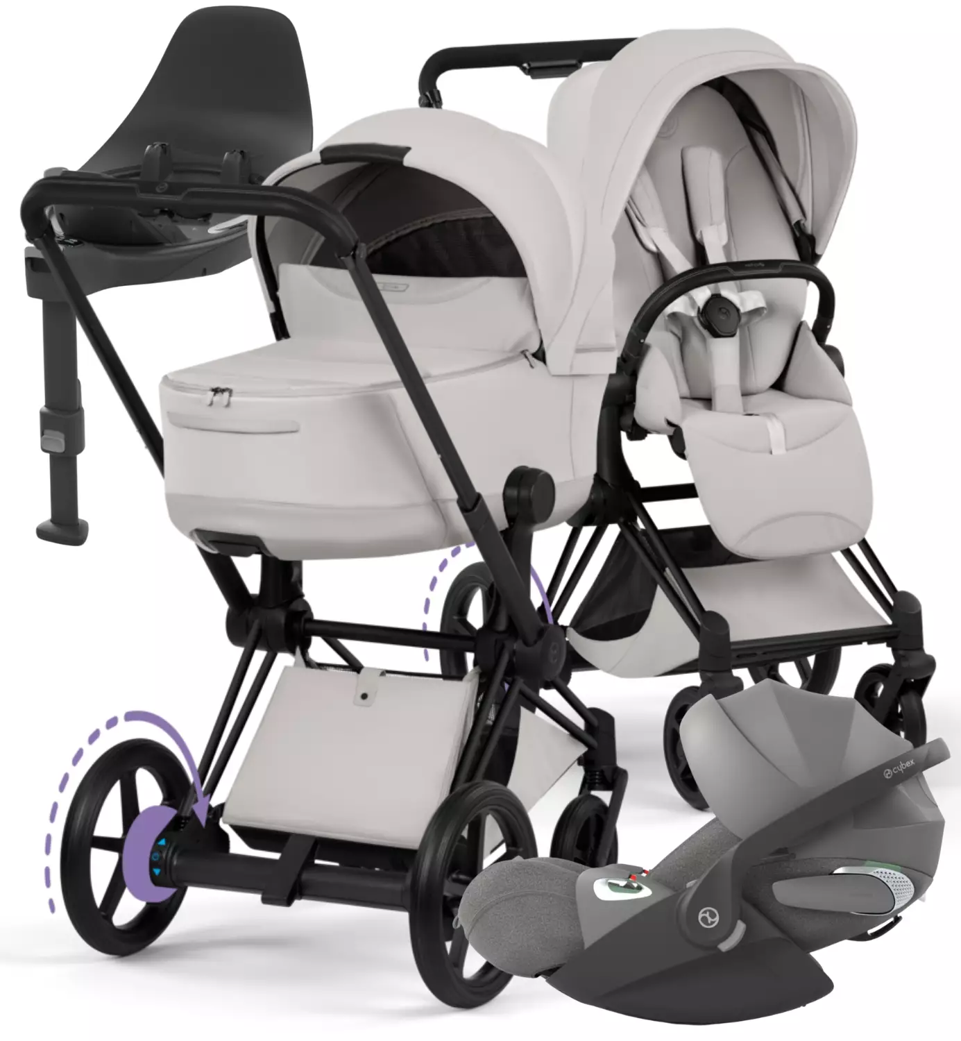 Valmiissa paketissa Sähköavusteiset Cybex ePriam Style yhdistelmävaunut + turvakaukalo ja jalusta. Premium tason mukavuutta, älykästä teknologiaa ja helppoutta syntymästä 4-vuotiaaksi.
