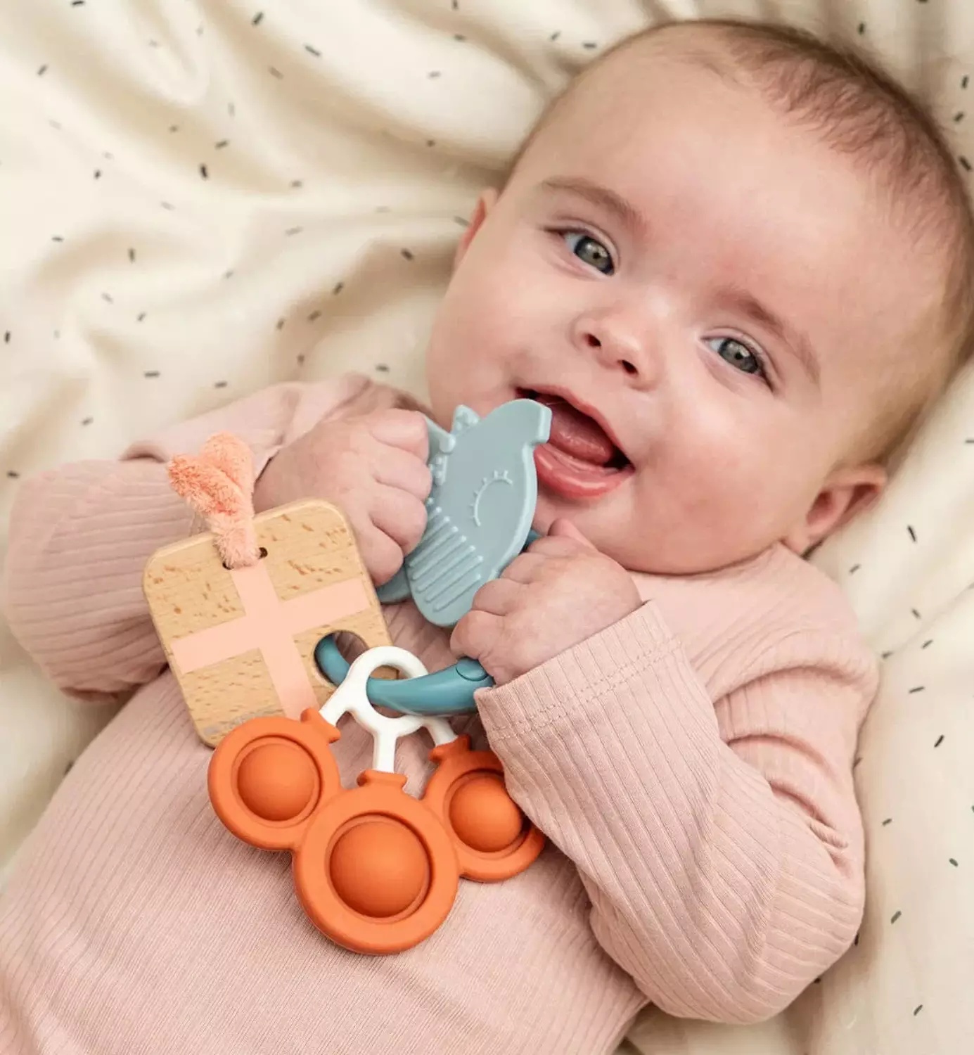 Monipuolinen aistilelu ja purulelu vauvalle, joka tukee motoriikkaa ja aistien kehitystä. Helppo tarttua pienillä käsillä!