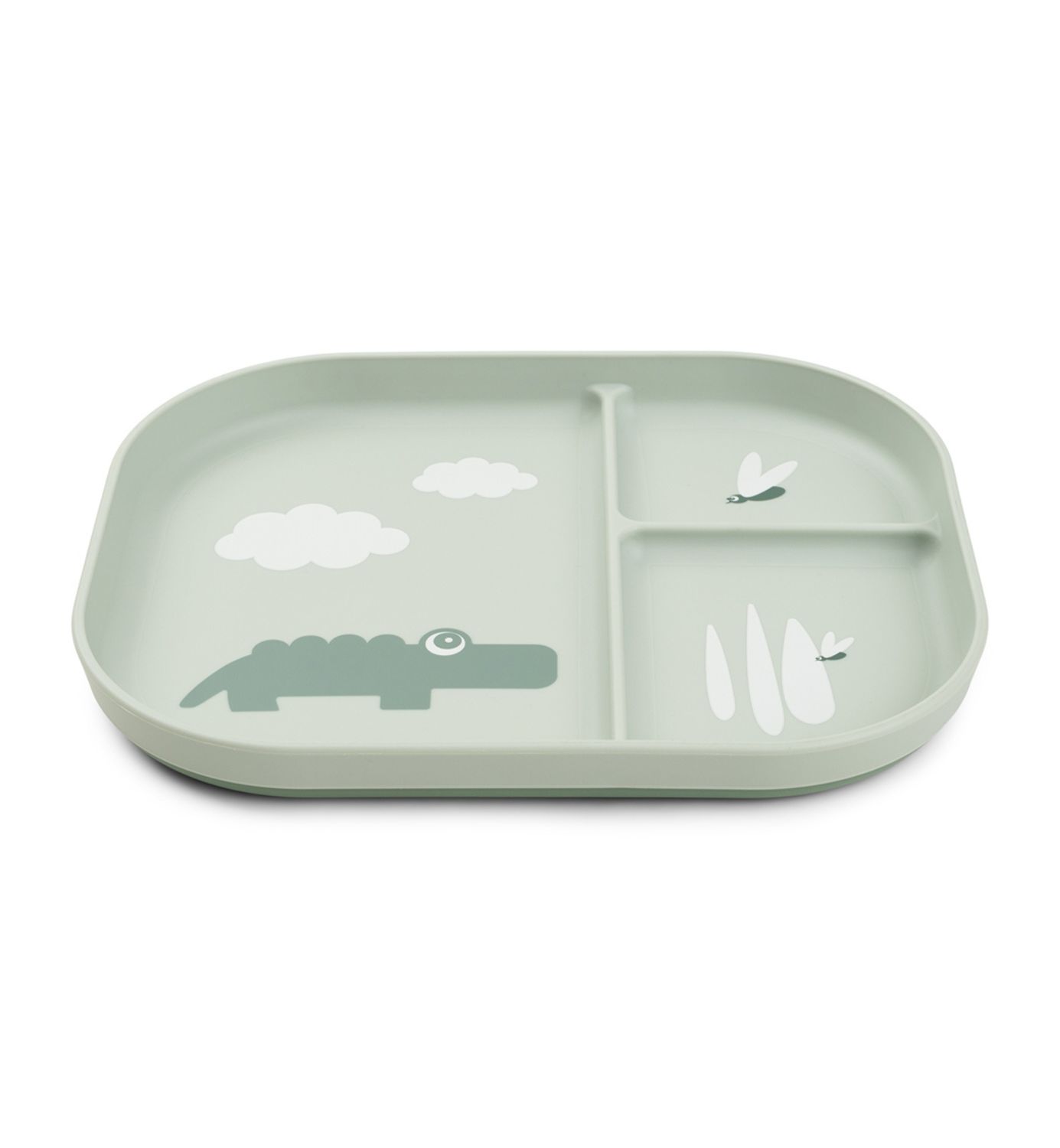 Done by Deerin suloiset lokerolliset lautaset mahdollistavat lapsen oppimaan paremmin yksittäisiä makuja ja tekstuureja. Lokeroissa ruoka pysyy omilla paikoillaan, ja perheen pienimmän on helppo opetella itsenäistä ruokailua! Lautasen reunat tekevät syömiestä helppoa, ja anti-slip pohjan ansiosta se pysyy pöydällä paikoillaan. Suloinen vihreä krokotiili motivoi lasta syömään lautasen tyhjäksi, kun hän huomaa kuvan ilmestyvän pohjasta.