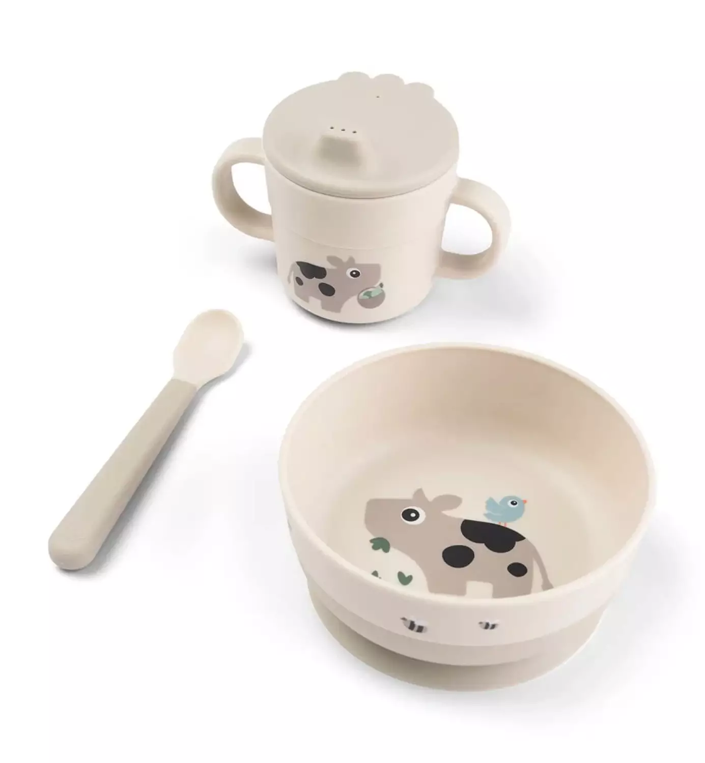 Done by deerin Foodie-sarjaan kuuluva ensimmäinen ruokailusetti. Suloisilla kuvilla varustettu kulho ja nokkamuki ilahduttavat pientä ruokailijaa! Kulhon pohjassa on silikoninen imukuppi, joka auttaa pitämään lautasen napakasti paikallaan. Myös nokkamukin anti-slip pohja estää mukin liukumista pöydällä. Astiat ovat astianpesukoneen ja mikron kestäviä, mikä helpottaa arjen askareita.