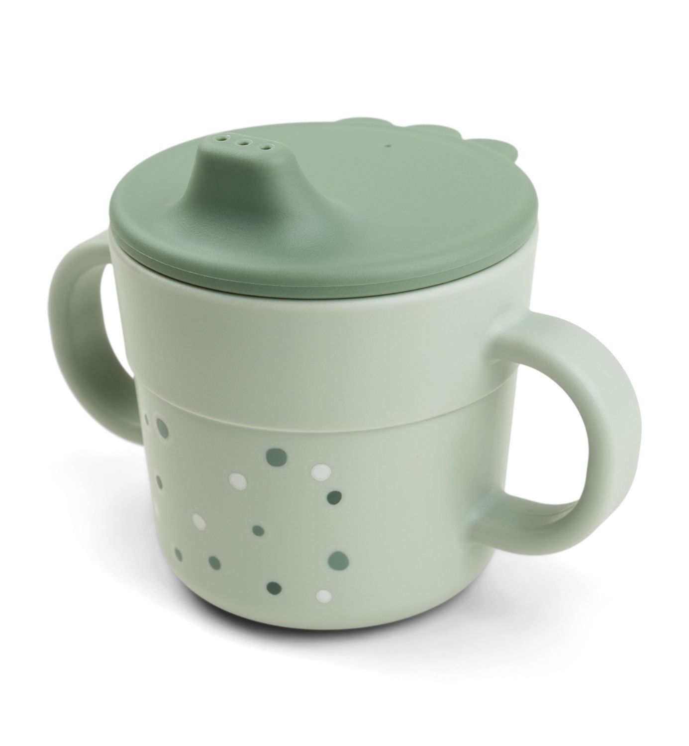 Done by Deerin Foodie-sarjan super käytännöllinen 2-in-1 nokkamuki, sopii loistavasti pienen kokonsa puolesta juomisen harjoitteluun. Lapsen kasvaessa, nokkakannen voi ottaa pois ja täten lisää mukin käyttöikää. Kahvojen ansiosta lapset saavat mukista tukevan otteen, ja harjoittelu sujuu helpommin! Mukin anti-slip pohja varmistaa sen, ettei muki pääse liikkumaan pöydällä. Suloinen Happy Dots -kuosi tuo iloa perheen yhteisiin ruokahetkiin!