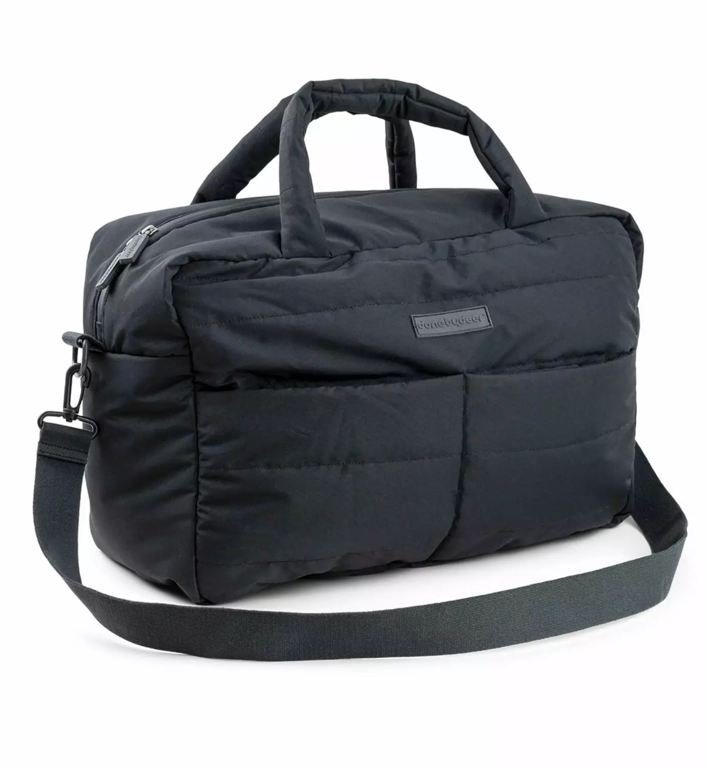 Tässä hoitolaukussa yhdistyy käytännöllisyys ja tyylikkyys. Laukkuun on käytetty 48 kierrätettävää PET muovipulloa. Laukku on erittäin tilava ja taskujen ansiosta tavarat pysyvät hyvässä järjestyksessä. Laukun voit ripustaa sen vaunuun tai rattaaseen mukana tulevilla kiinnitysremmeillä. Lisäksi matkassa tulee olkahihna, joten voit kantaa sitä mukana missävain. Taitettava kosteuden kestävä hoitoalusta kuuluu laukun varustukseen ja kulkee näppärästi aina mukana. Olkahihna ovat säädettävissä. Laukun pinta on helposti pyyhittävissä puhtaaksi kostealla liinalla.