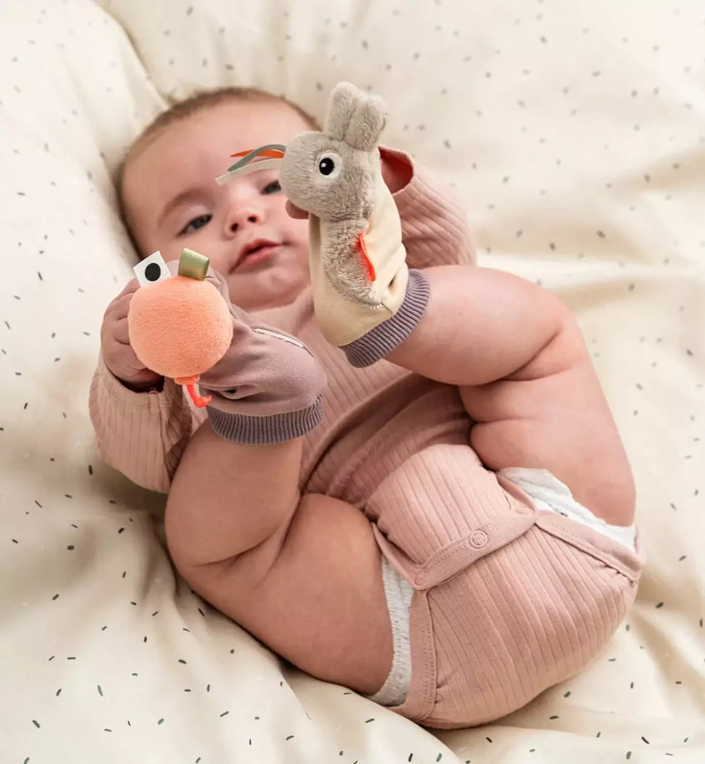 - Aktivoi koko kehoa: rohkaisee vauvaa potkimaan, kurottamaan ja tarttumaan