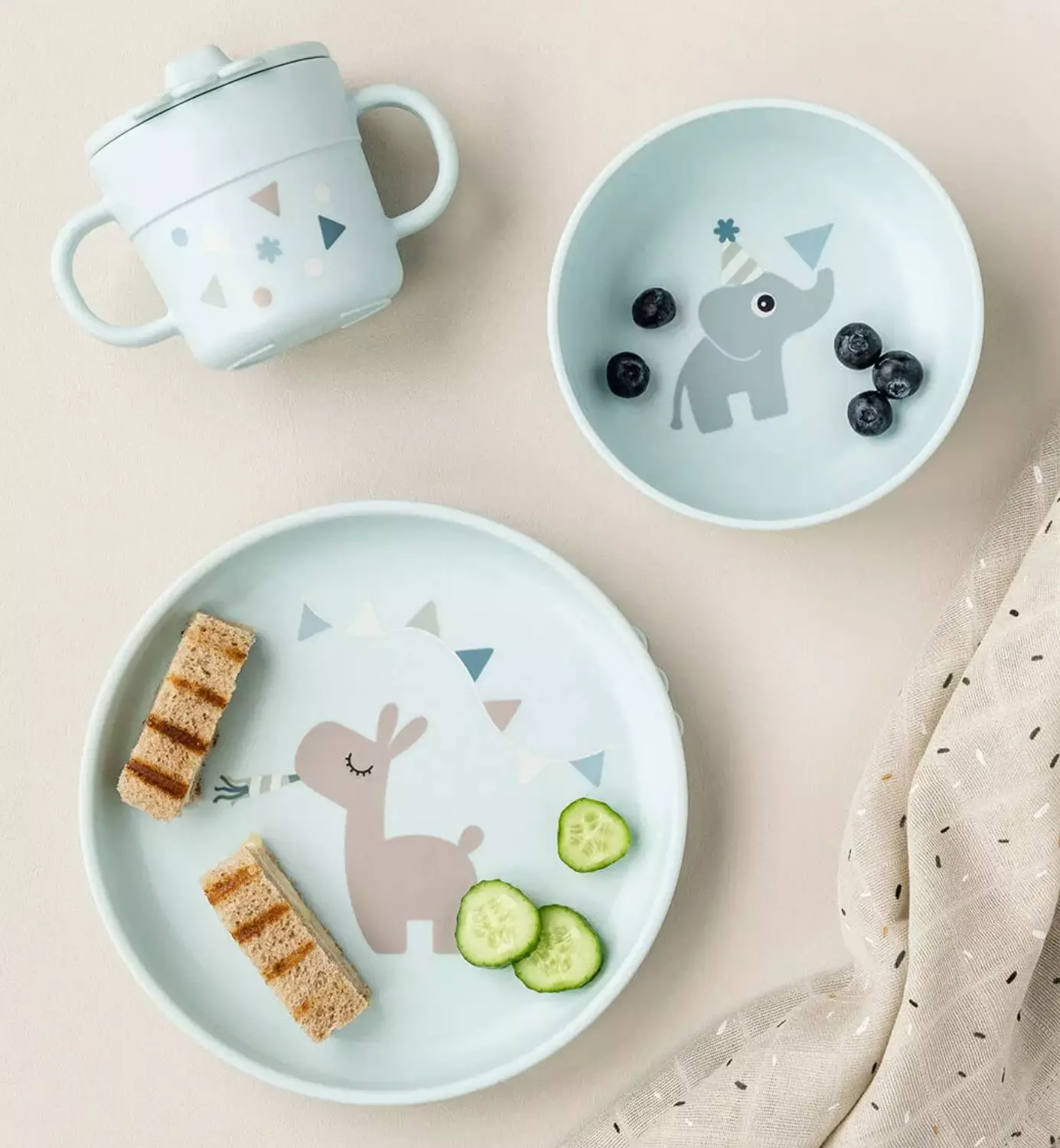 Lokerolautanen, aterimet ja muki - tässä on täydellinen paketti itsenäiseen ruokailuun! Imukupilla varustettu lautanen pysyy näppärästi kiinni pöydässä.
