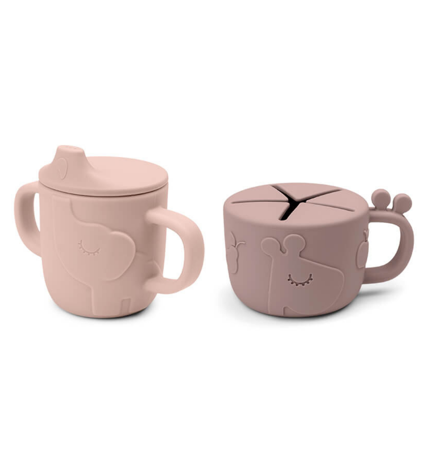 Silikoniset muki ja snack -kippo ovat kätevä paketti ruokailua aloittelevalle ja hieman isommallekin lapselle. Pehmeästä silikonista valmistetut astiat ovat kestäviä, pehmeitä ja turvallisia eivätkä ne luista sotkuisissakaan pienissä käsissä. Muotoilunsa ansiosta niistä on helppo pitää kiinni pienellä kädellä. Snack -kippoon voi laittaa vaikka hedelmäpaloja tai muita herkkuja ja ne pysyvät astiassa vaikka se välillä olisikin väärin päin. Pienellä kädellä on kiposta helppo ottaa eväitä. Nokkamuki on mukavan tuntuinen ja turvallinen pieneen suuhun ja sen kahvat helpottavat juomisen harjoittelua. Konepestävät astiat on helppo pitää puhtaana.