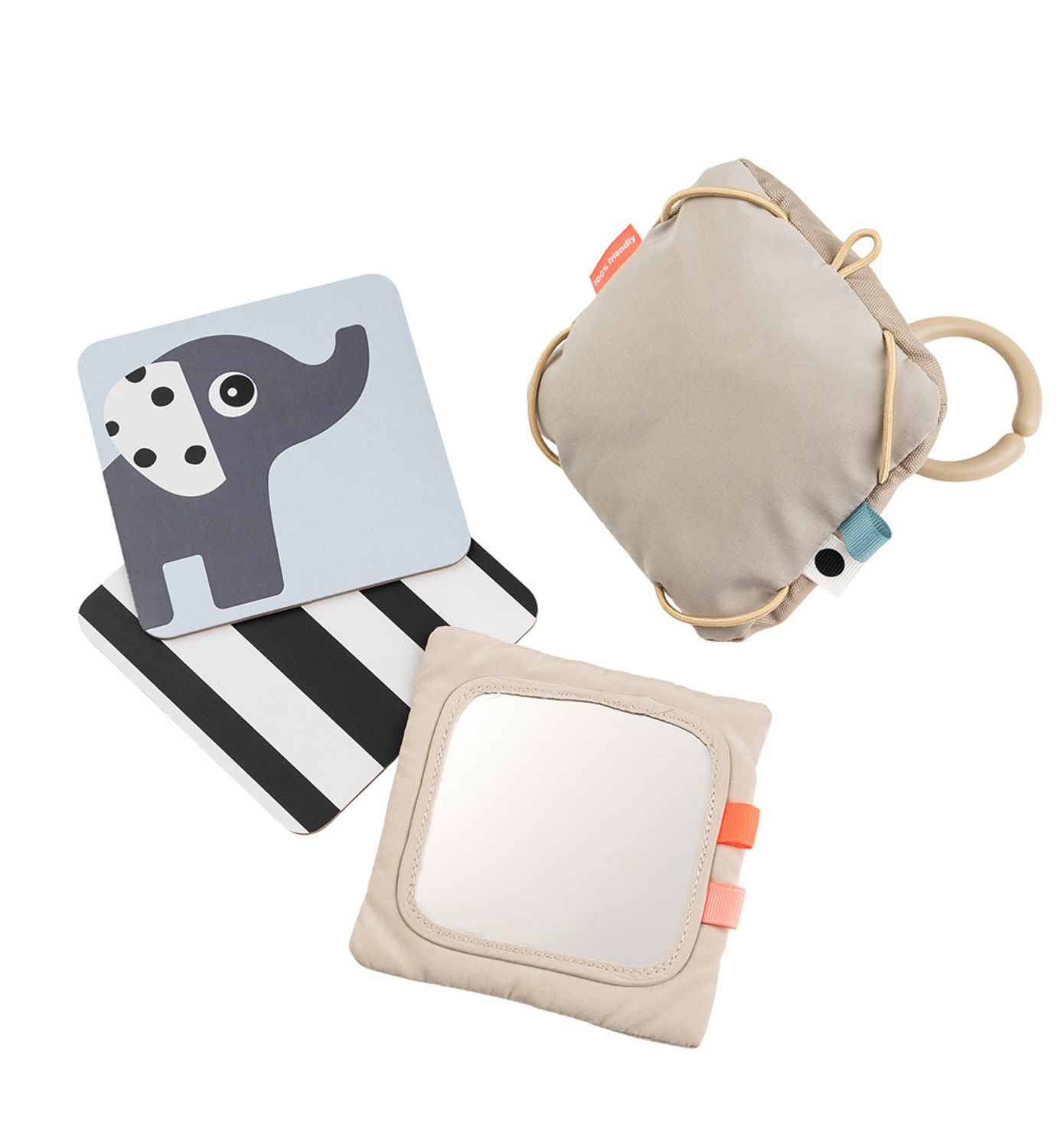 Helppo ripustaa leikkimaton kaareen, vaunuihin tai pinnasänkyyn. Kulmikkaan muotonsa takia sitä on helppo katsella myös mahallaan pötkötellen!