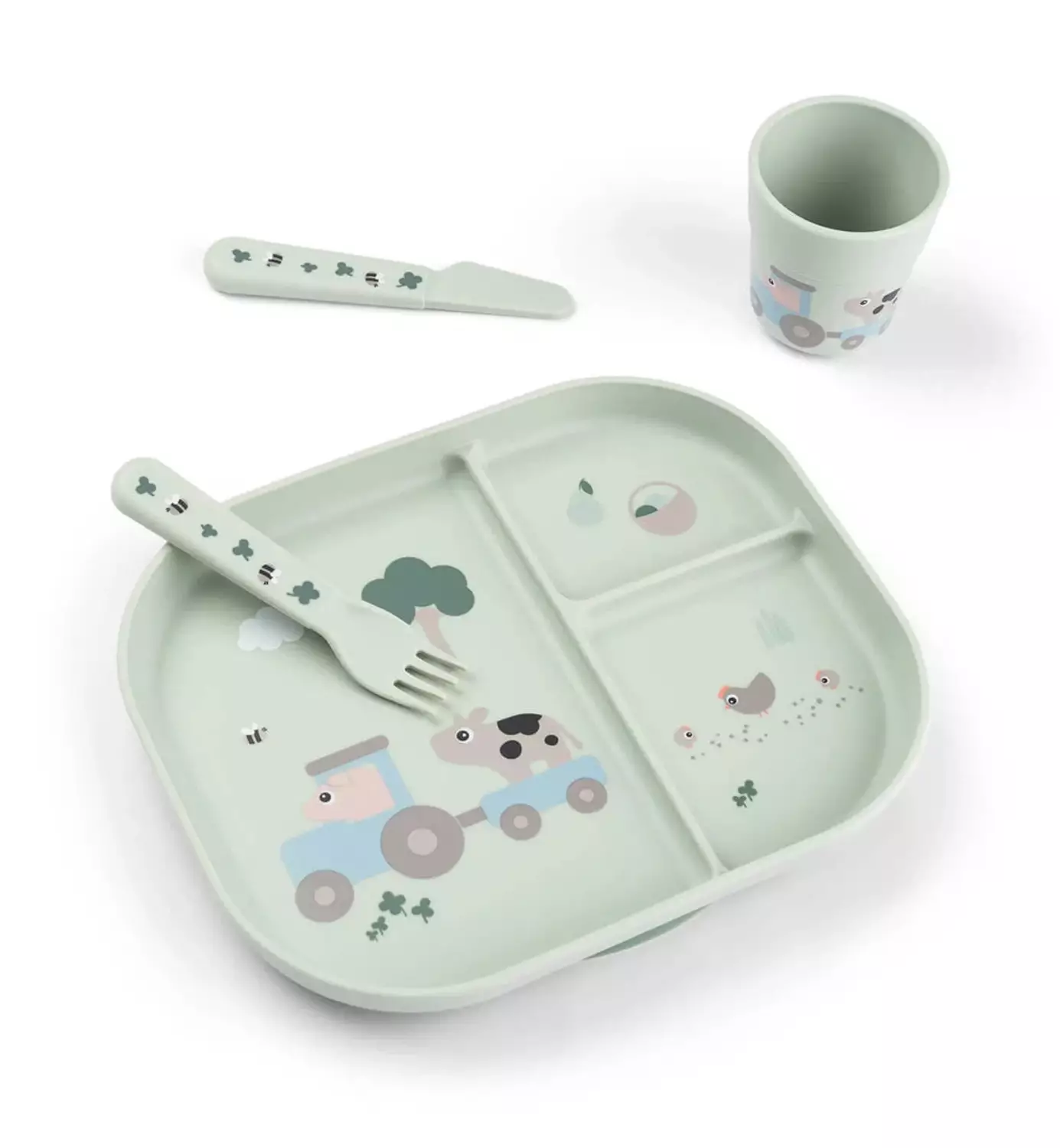Lokerolautanen, aterimet ja muki - tässä on täydellinen paketti itsenäiseen ruokailuun! Imukupilla varustettu lautanen pysyy näppärästi kiinni pöydässä.
