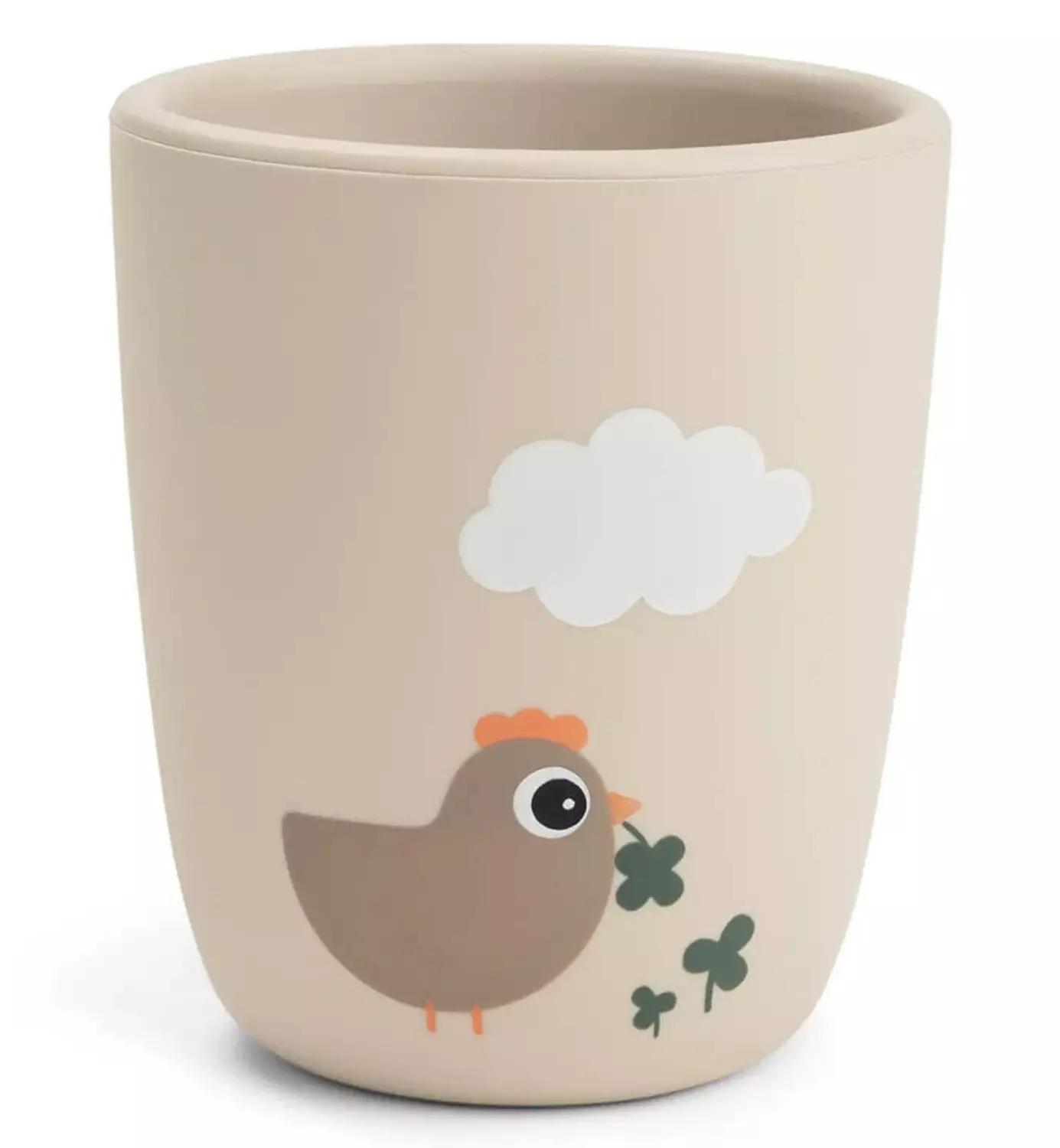 Silikonisesta mukista saa hyvän otteen juomista harjoitellessa. Tilavuus on juuri sopiva pienelle!