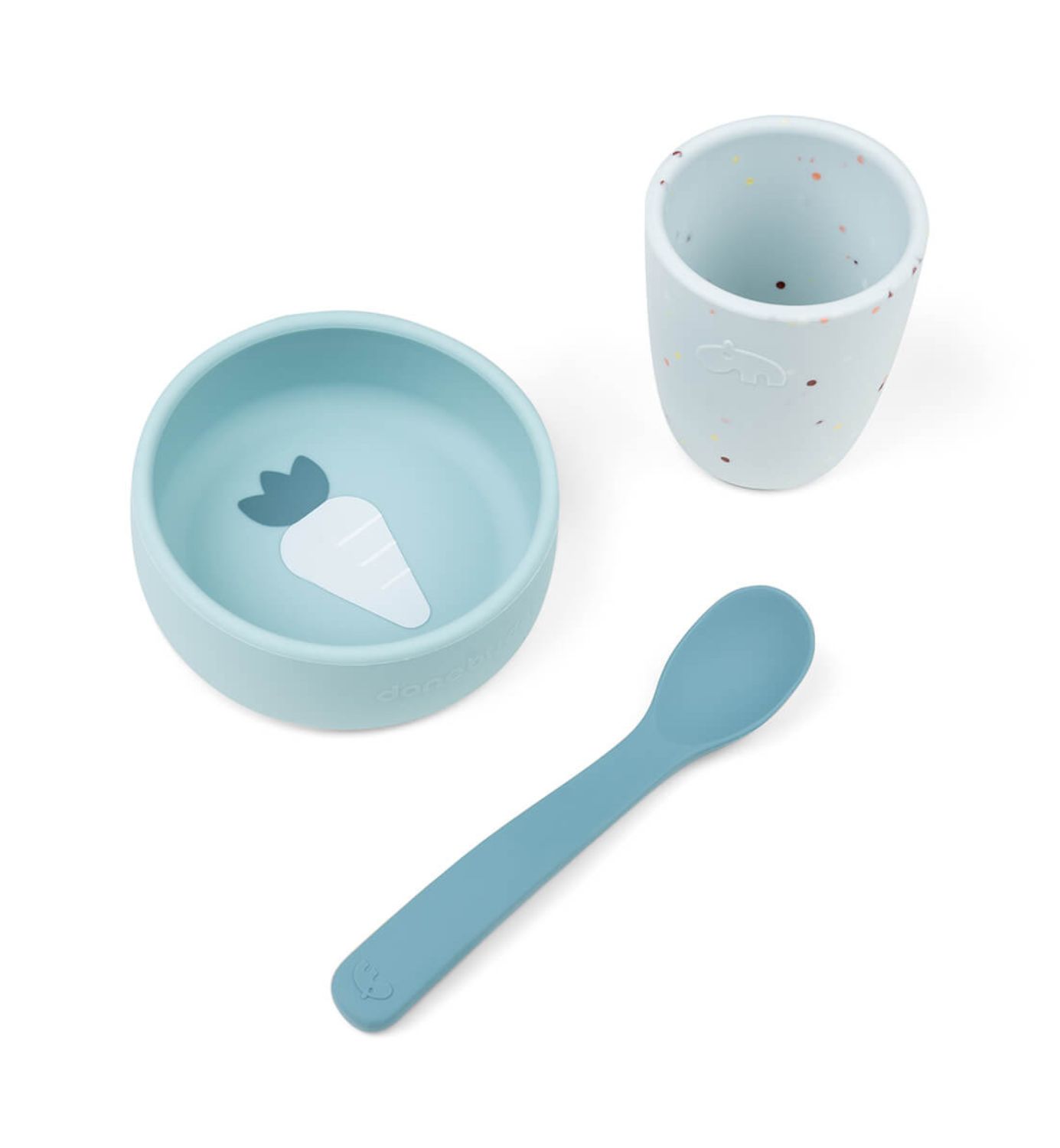 Ensimmäiset omat astiat pikkuruokailijalle kivassa lahjapaketissa. Silikoniset astiat sopivat hyvin käteen eivätkä luista vaikka tulisi vähän sotkuakin. Pakkauksessa on mukana minimuki, lusikka sekä korkeareunainen kulho. Syvän lautasen pyöristetyt kulmat helpottavat ruoan lusikoimista. Kestävät silikoniastiat voi pestä astianpesukoneessa ja ne kestävät myös mikron, uunin ja pakastamisen.