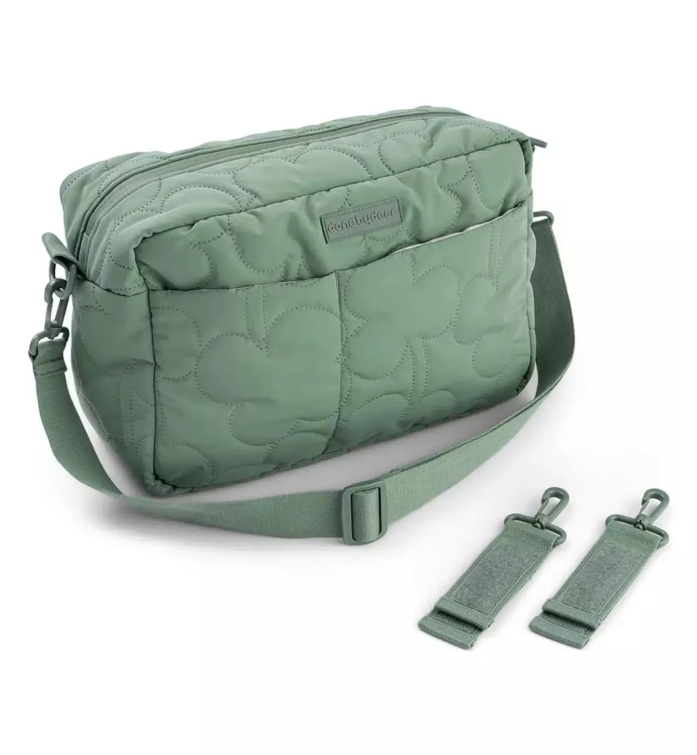 Laukun mukana tulee sekä säädettävä, irrotettava olkahihna että käytännölliset rataskiinnikkeet tarranauhalla. Näin laukku kulkee aina mukana – rattaissa, olalla tai käsissä.