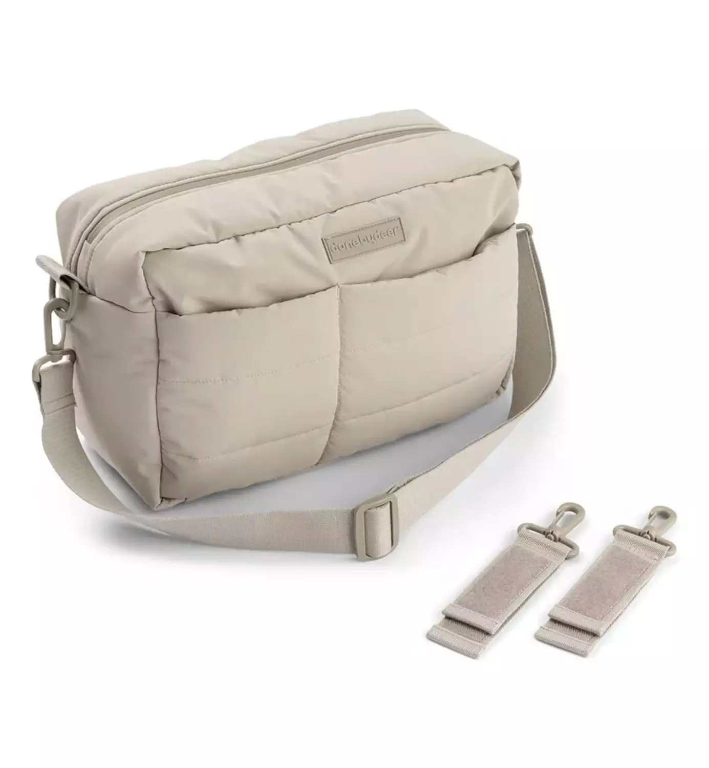 Laukun mukana tulee sekä säädettävä, irrotettava olkahihna että käytännölliset rataskiinnikkeet tarranauhalla. Näin laukku kulkee aina mukana – rattaissa, olalla tai käsissä.