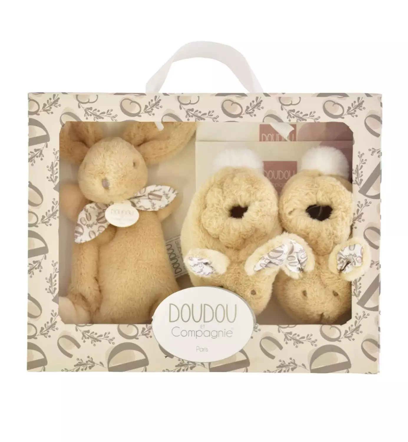 Pörröiset tossut ja pupu-unilelu - tyylikäs lahjapakkaus on helppo ja kaunis lahja esimerkiksi babyshowereille, tai kun menet tapaamaan pientä vastasyntynyttä ensimmäistä kertaa.