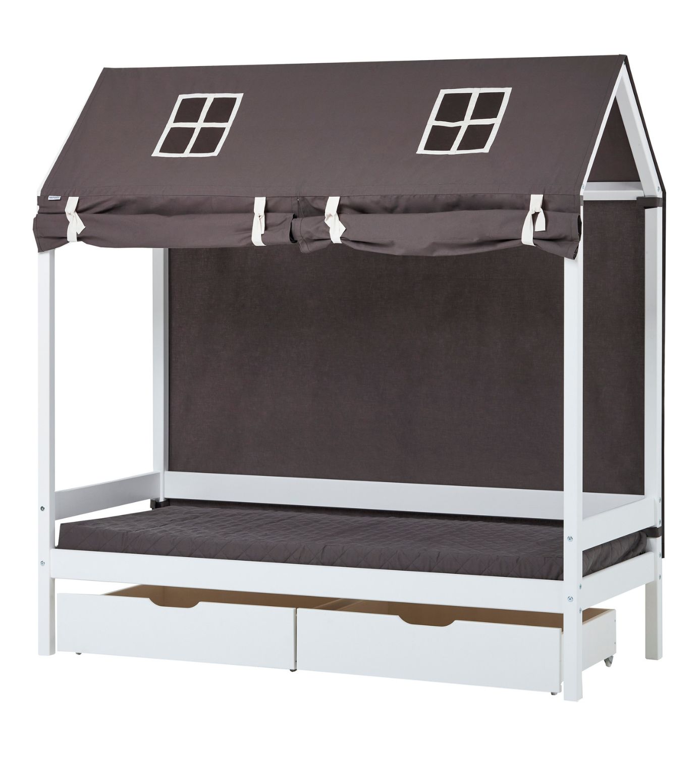 Katosverholla muokkaat Talosänkyyn erilaisia, kotoisia tunnelmia. Vain mielikuvitus on rajana ja lapsella on kiva pesämäinen sänky. Verhot on jaettu keskeltä, joten voit asetella ne monella eri tapaa. Katosverho on helppo kiinnittää tarranauhoilla. Puuvillainen katosverho voidaan pestä 30 asteessa ja silittää.