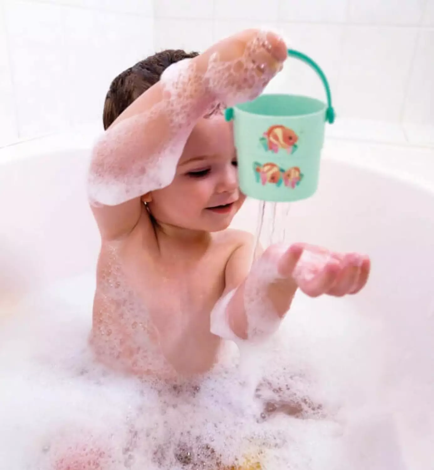 Kaada, tutki ja ihmettele veden liikettä leikin lomassa! Värikkäät Janod kylpyleikkiämpärit tekevät kylpyhetkestä hauskan.