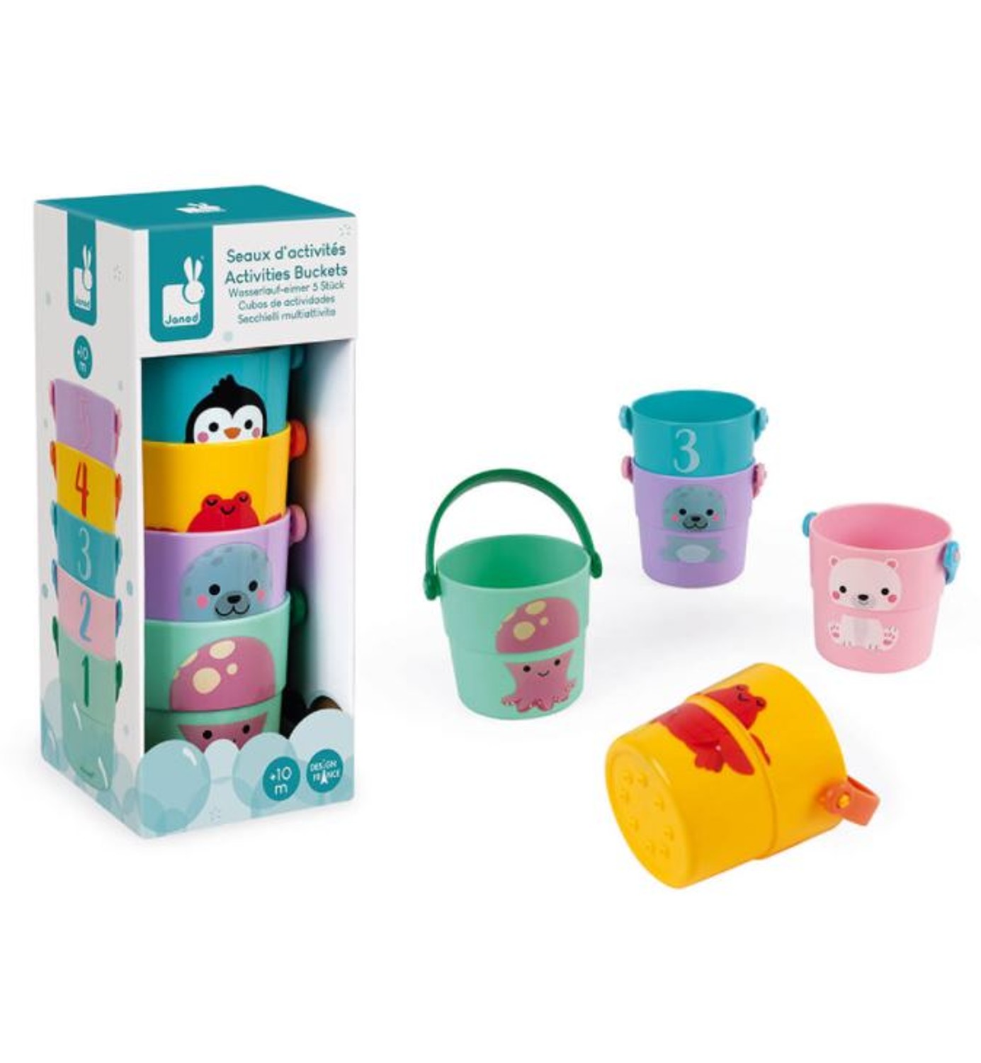 Kylpylelut hauskoihin kylpyjetkiin 5 kpl paketissa. Jokaisen ämpärin toisella puolella on kiva eläinhahmo ja toisella puolella numerot yhdestä viiteen. Jokaisen ämpärin pohjassa on eri kokoisia reikiä ja voit täyttää ämpärin vedellä ja tehdä suihkun! Kiva lelusetti pienelle lapselle. Eläinhahmoista löytyy: mustekala, jääkarhu, pingviini, rapu ja hylje.