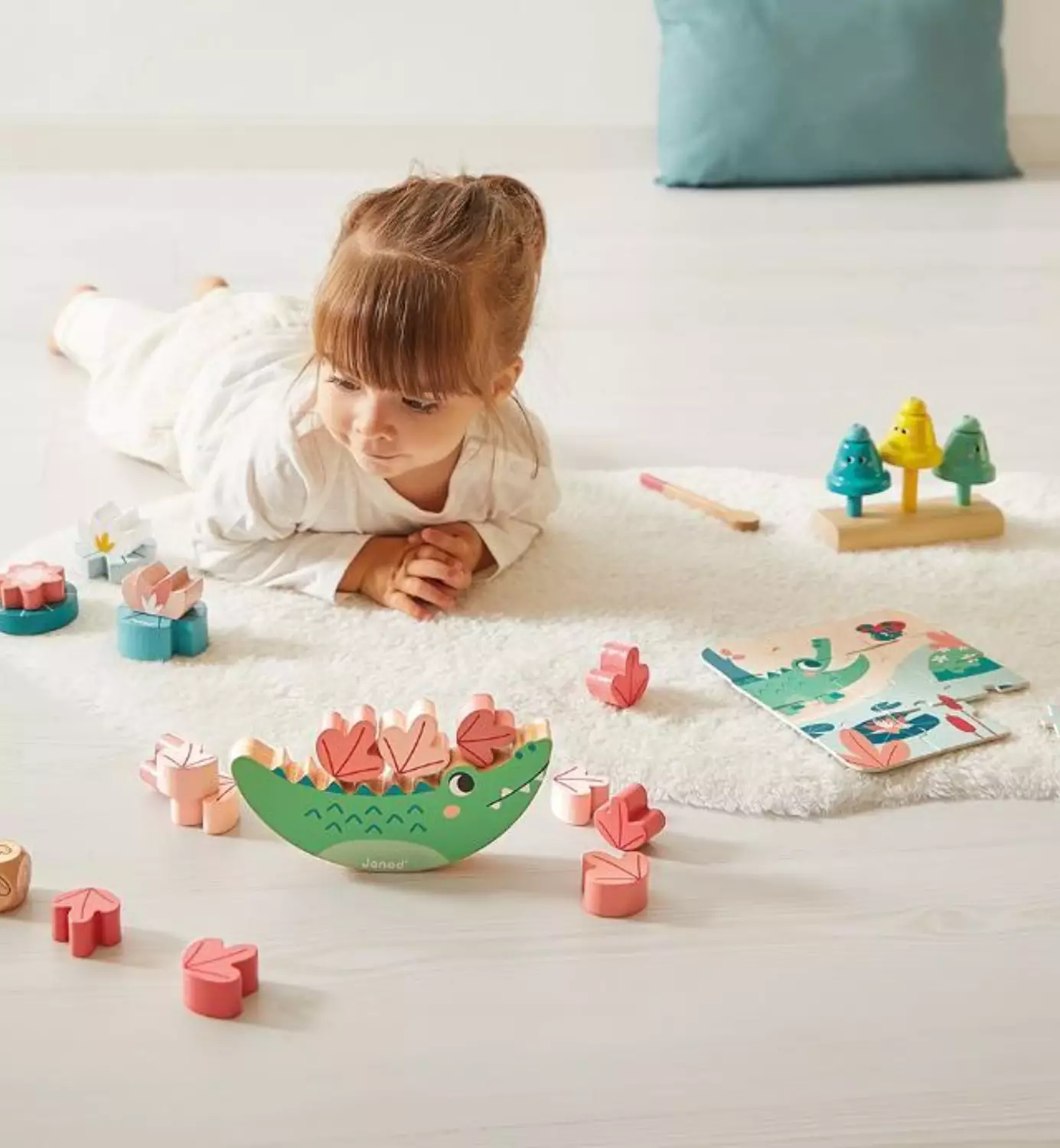 Jännittävä tasapainoleikki, jossa pinotaan lehtiä krokotiilin selkään ilman että torni kaatuu. Kehittää koordinaatiota, strategista ajattelua ja kärsivällisyyttä.