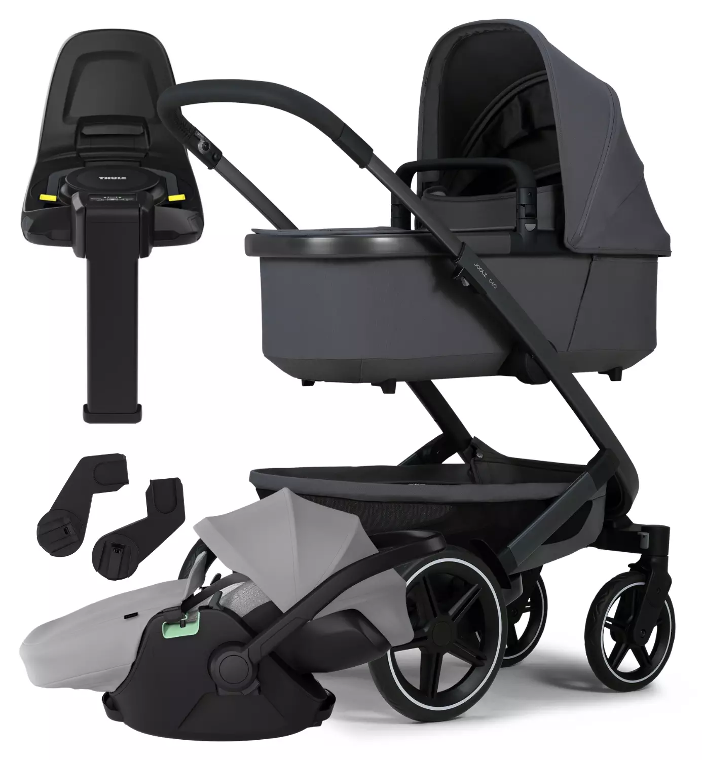 Täydellinen Joolz Geo³setti, joka sisältää rungon, etu- ja takarenkaat, vaunukopan, istuimen, tavarakorin, turvakaaren ja käyttöohjeet.