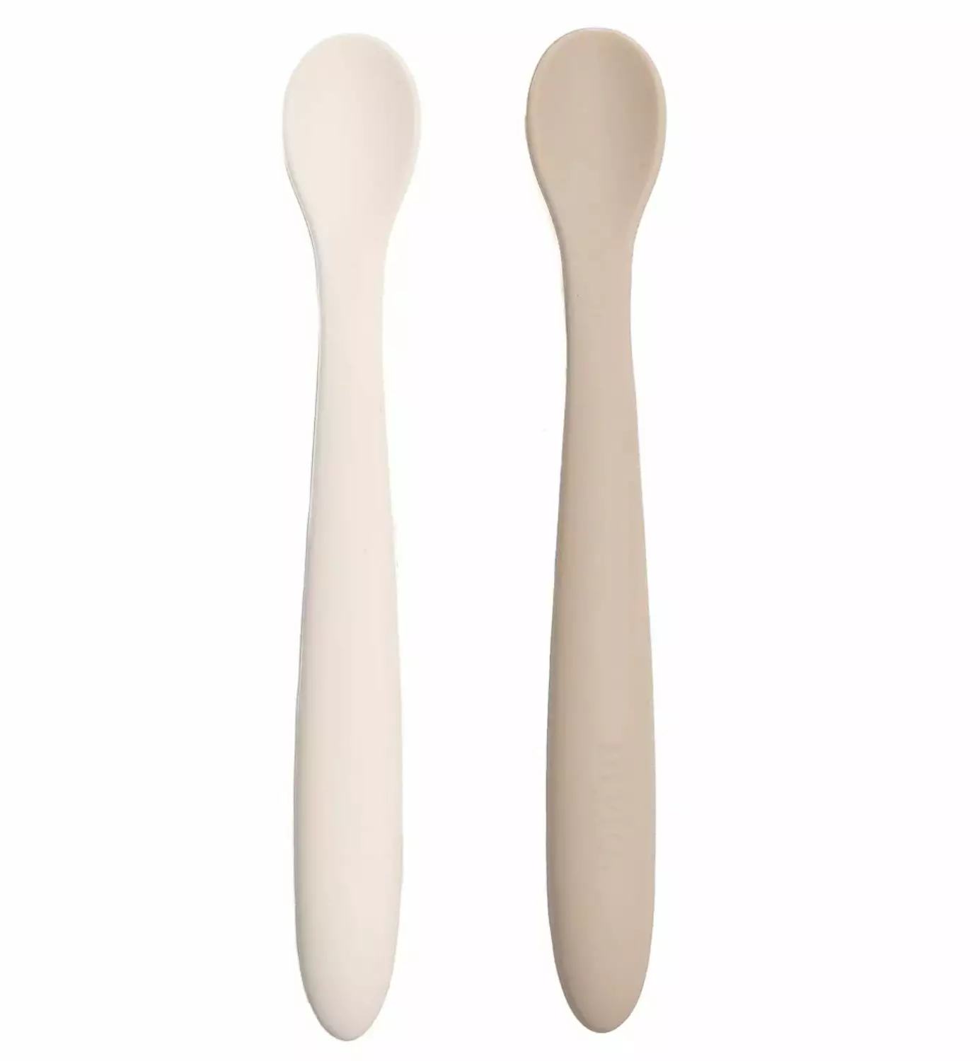 Pitkävartinen silikoninen lusikka yltää ruokapurkin pohjalle asti ja on ihanan hellä lapsen ikenille. Varren sisällä on ruostumattomasta metallista tehty vahvike, joten lusikan varren kaarevuutta voi itse säädellä.