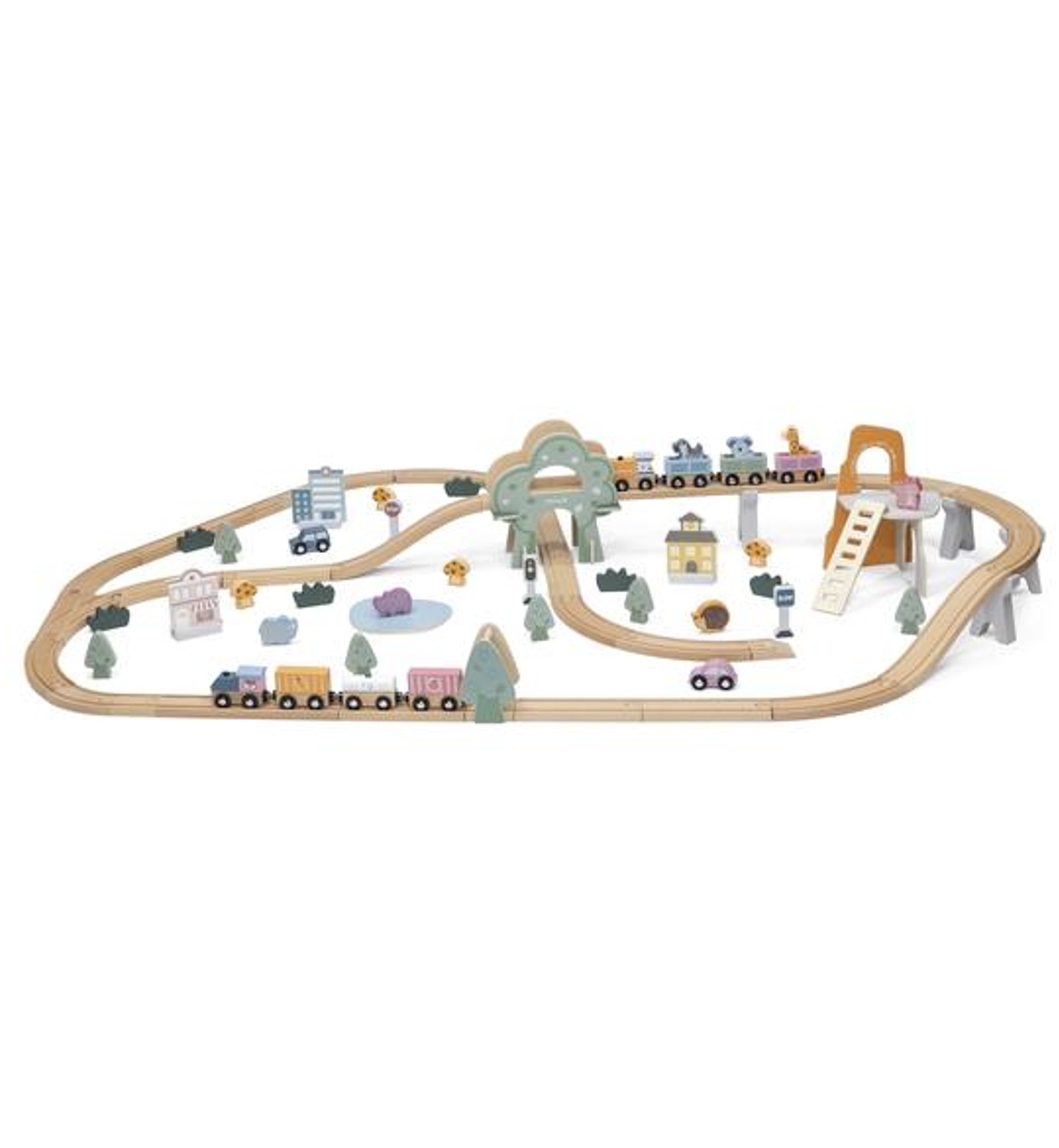 Minne juna matkustaa? Klassinen puinen junarata on hauska lelu jonka kanssa aika kuluu huomaamatta. Raiteet voi rakentaa erilaisiin muotoihin ja lisätä matkalle vaikka tunnelin. Junan vaunut kiinnittyvät toisiinsa sekä veturiin magneetilla. Pakkauksessa on mukana eläimiä, puita, taloja liikennemerkkejä ja autoja junaradan varrelle ja erilaisia ympäristöjä ja kaupunkeja varten. Junaratasetti sisältää yhteensä 90 puista osaa. Lelu kehittää mielikuvitusta, loogista ajattelukykyä, silmä-käsi koordinaatiota sekä motoriikkaa hauskasti leikin ohessa.