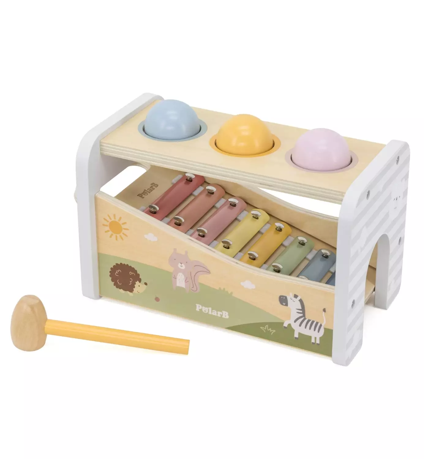 Hauskassa puulelussa yhdistyvät perinteinen hakka, ksylofoni ja guiro.